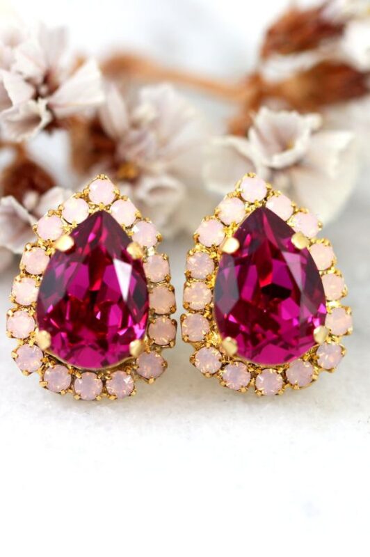 Magenta earrings will make your styling look complete. You can opt for Swarovski crystal earrings, which will beautifully reflect light and serve as a subtle accessory, or go for larger forms, e.g., in the shape of flowers.