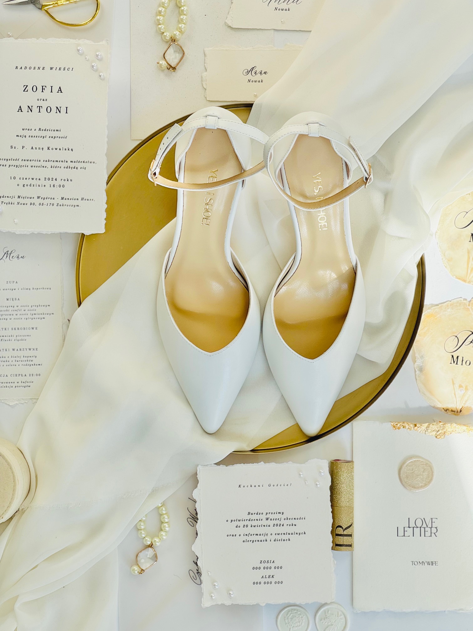 The shoes are made of natural full-grain leather in ivory – broken white, which is one of the most frequently chosen shades for weddings. It is an extremely versatile color that perfectly harmonizes with various tones of dresses – from slightly offset whites, through creamy shades of ecru, to pastel accents. Full-grain leather is distinguished by its elegant finish and high durability. It is soft, adapts to the foot and works beautifully in motion. It is a material that not only makes the shoes look luxurious, but also provide comfort during many hours of use.