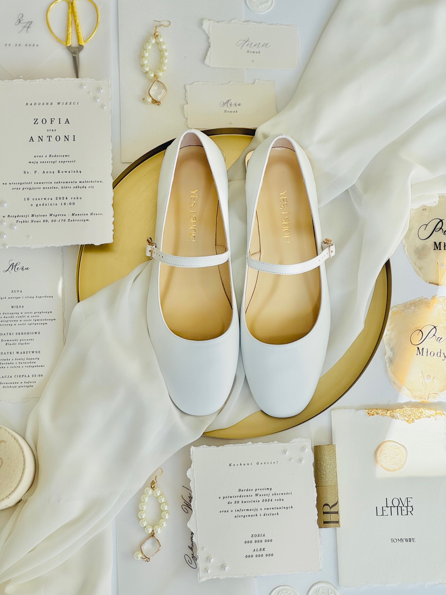Although Leokadia Ivory is a flat model, it does not lack character. The design is complemented by a glossy heel with a height of 1.3 cm, which gives the whole thing a unique, modern expression. It is a subtle detail that beautifully reflects light and adds lightness to the shoes, making ballet flats a full-fledged element of wedding styling – not only practical, but also effective.