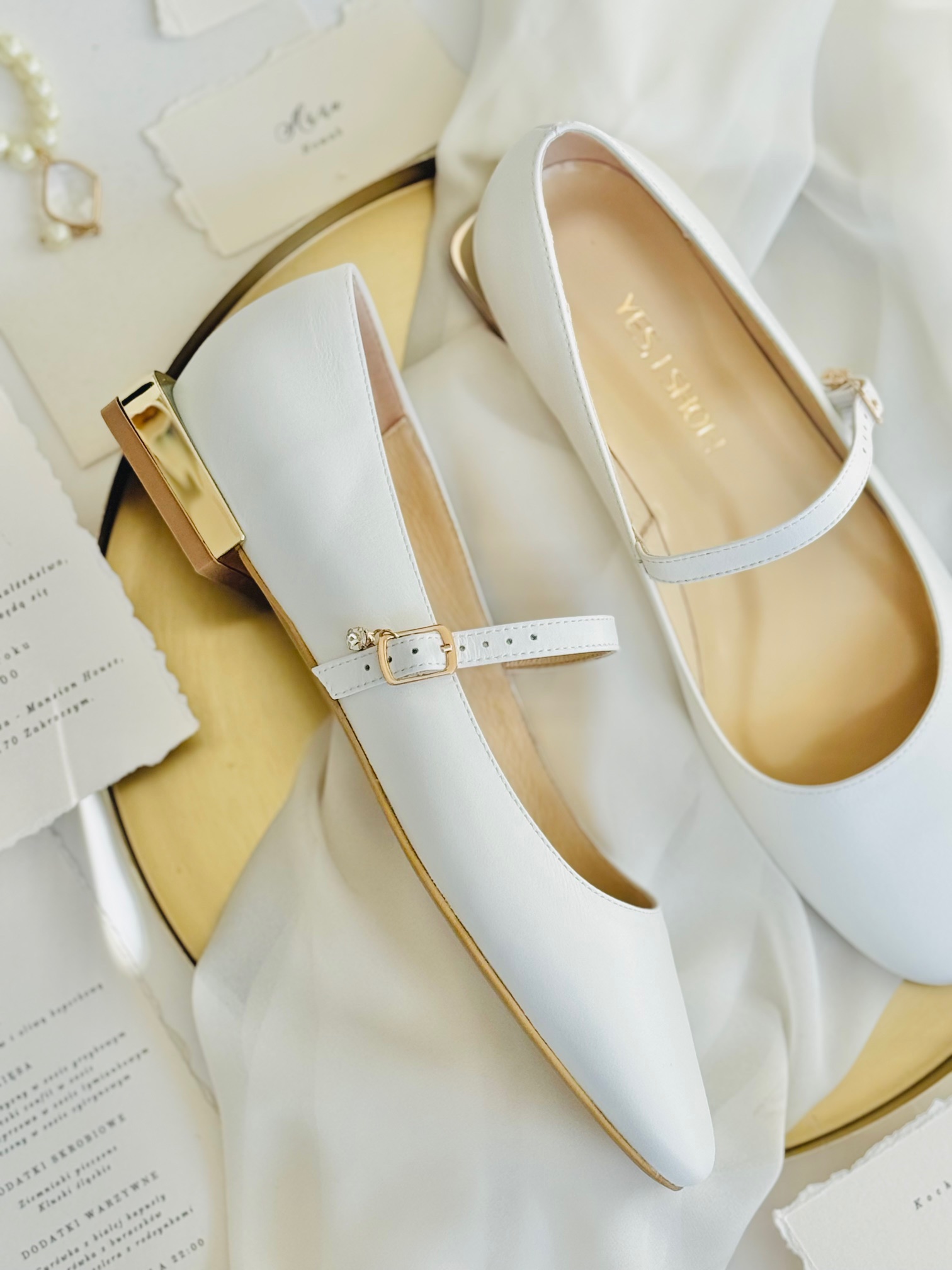 The ballet flats are made of natural full-grain leather in a shade of off-white. It is a material that impresses not only with its durability, but also with its noble appearance. The neutral color goes perfectly with classic wedding dresses, but it also goes well with modern cuts, adding a subtle elegance to them.