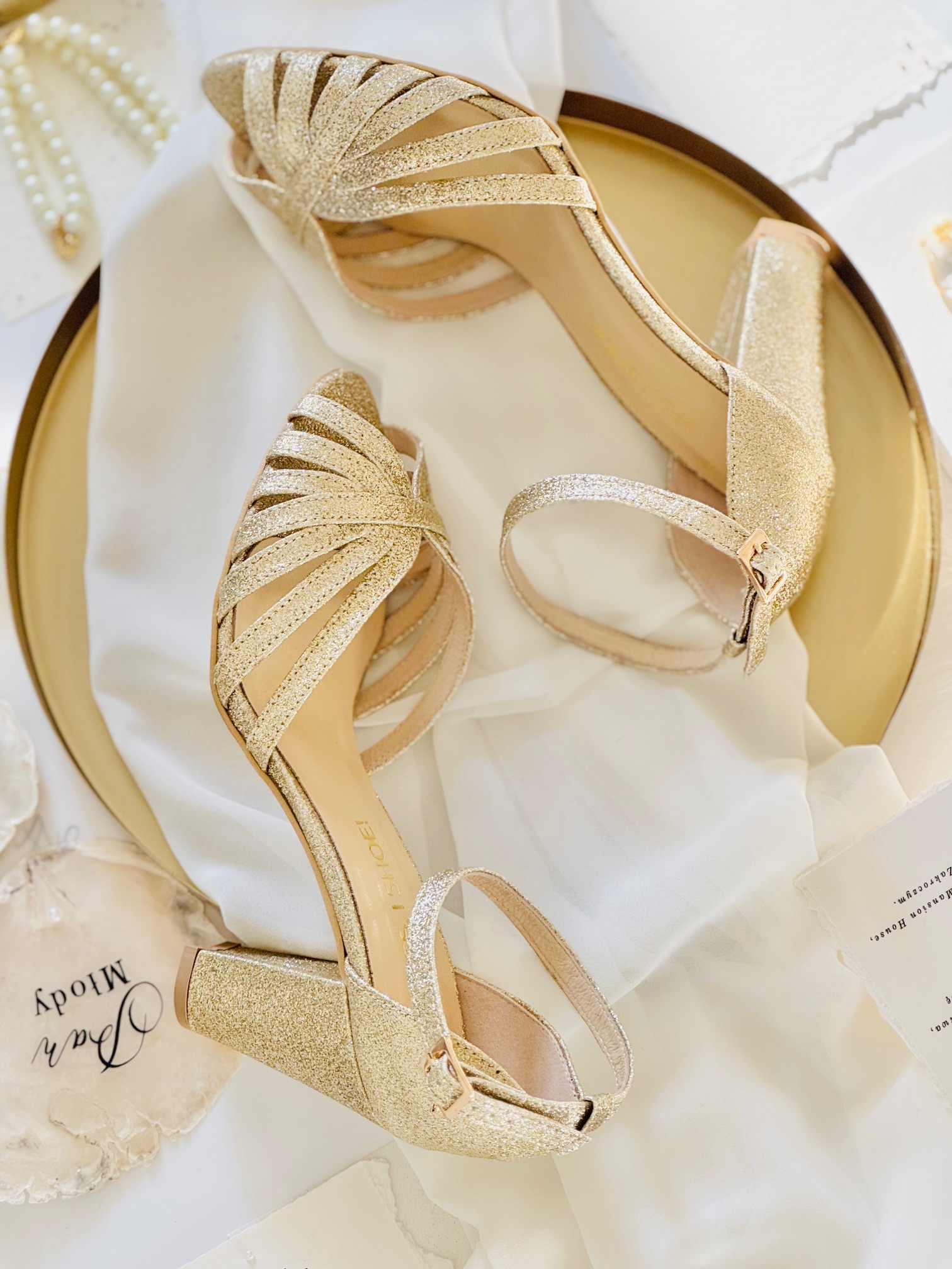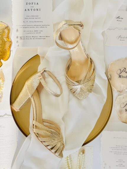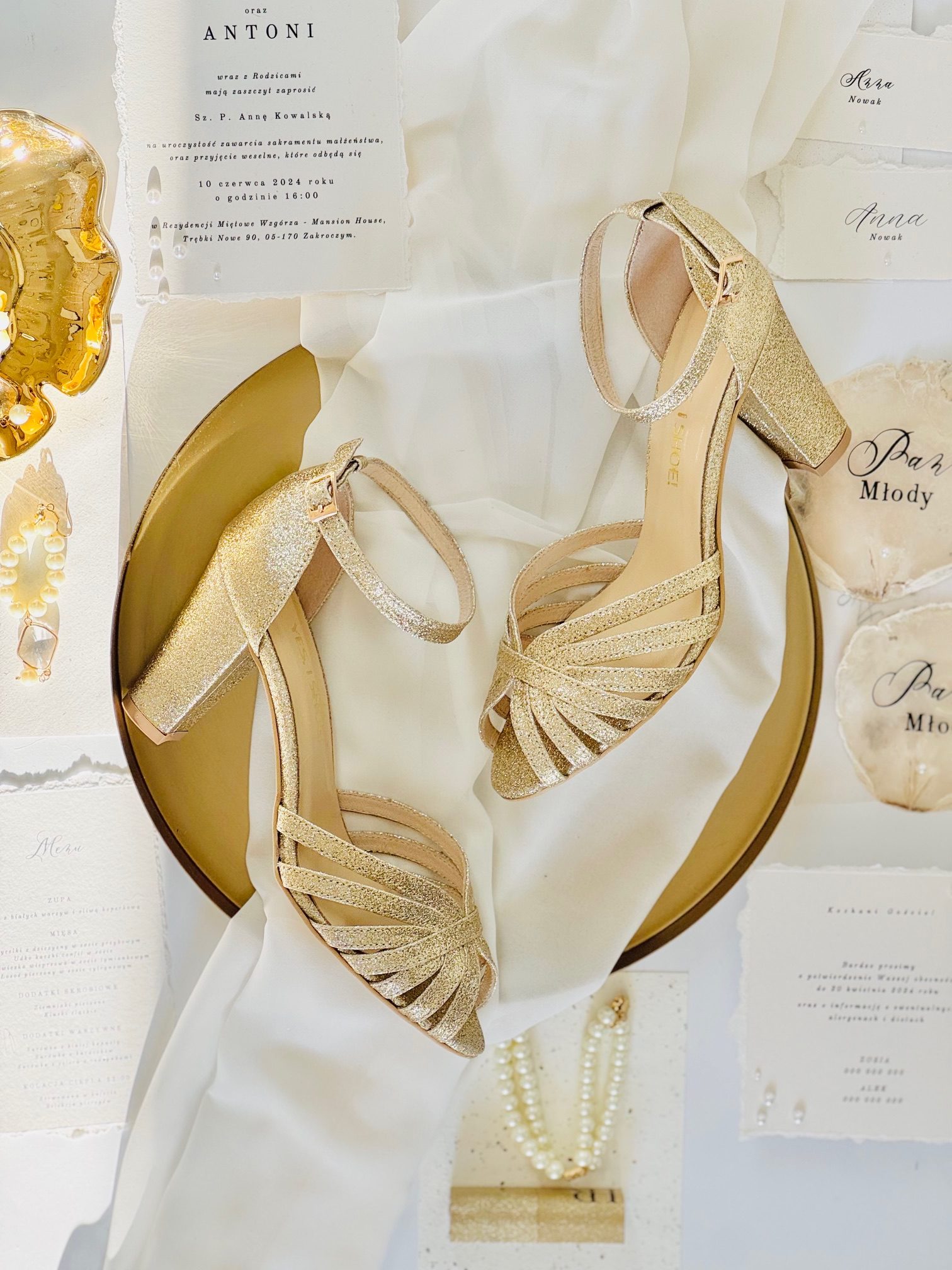Eleganckie buty ślubne na kopycie tanecznym – komfortowy słupek, złoty brokat.