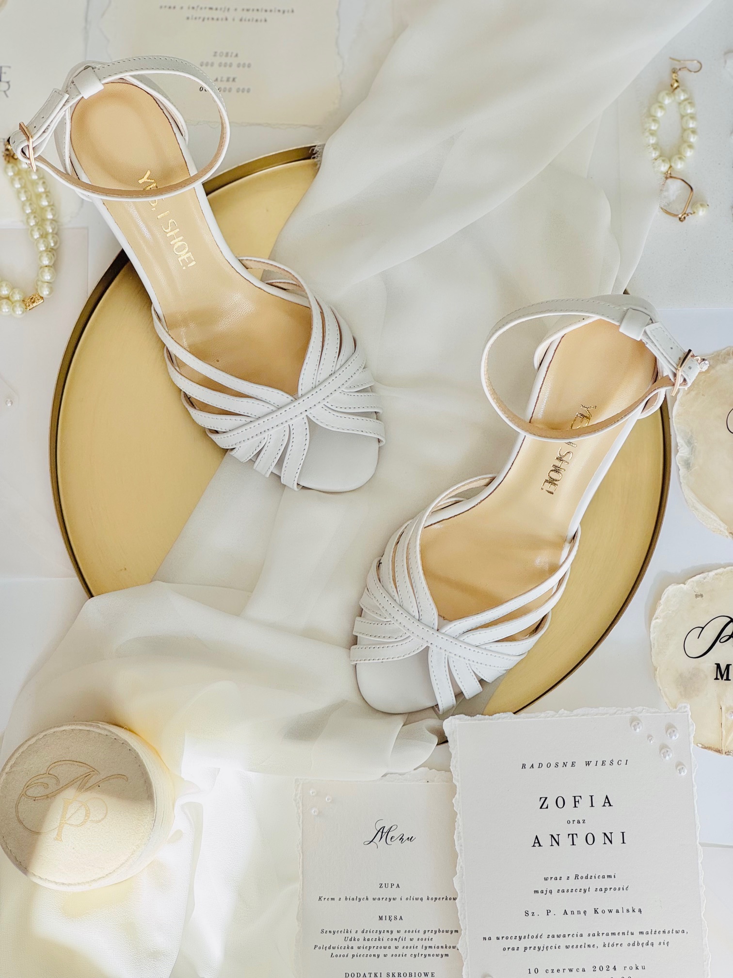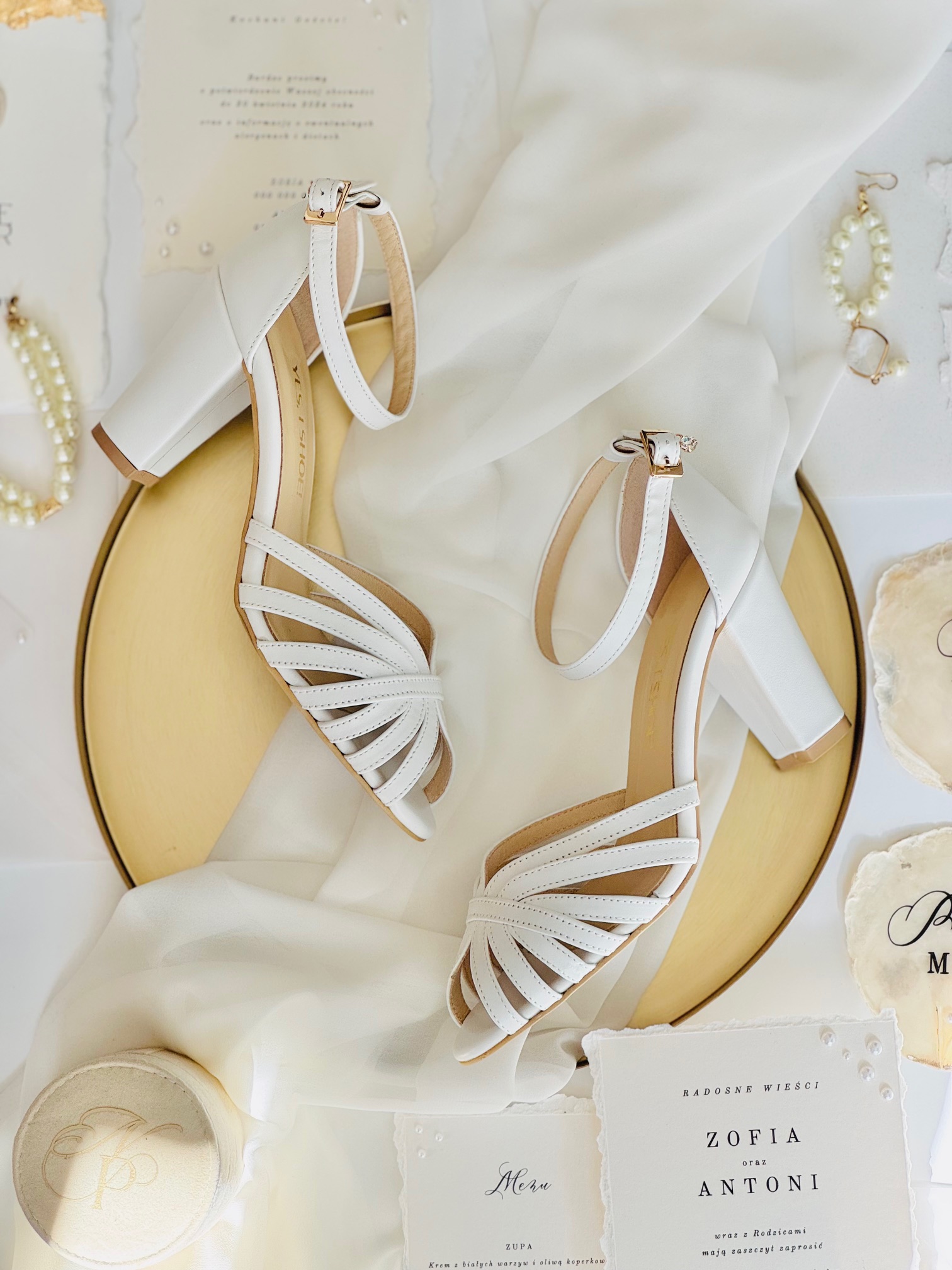 Buty ślubne zostały wykonane na kopycie tanecznym, które doskonale zabezpiecza stopę podczas tańca. Wykończone skórą licową w odcieniu przełamanej bieli będą stanowiły idealny dodatek do sukni ślubnej. W konstrukcji obcas został cofnięty głębiej pod piętę i odpowiednio wyprofilowany, co gwarantuje idealne podparcie stopy i stabilność przez cały dzień. Obcas w kształcie słupka o wysokości 8 cm optycznie wydłuży sylwetkę i podkreśli Twoją kobiecość.