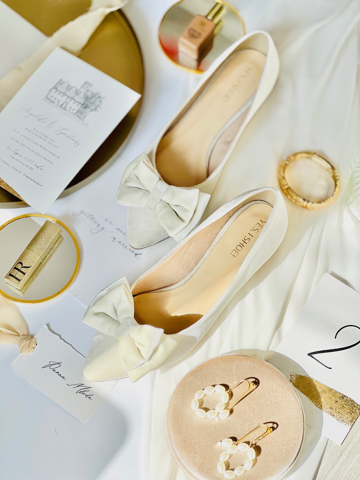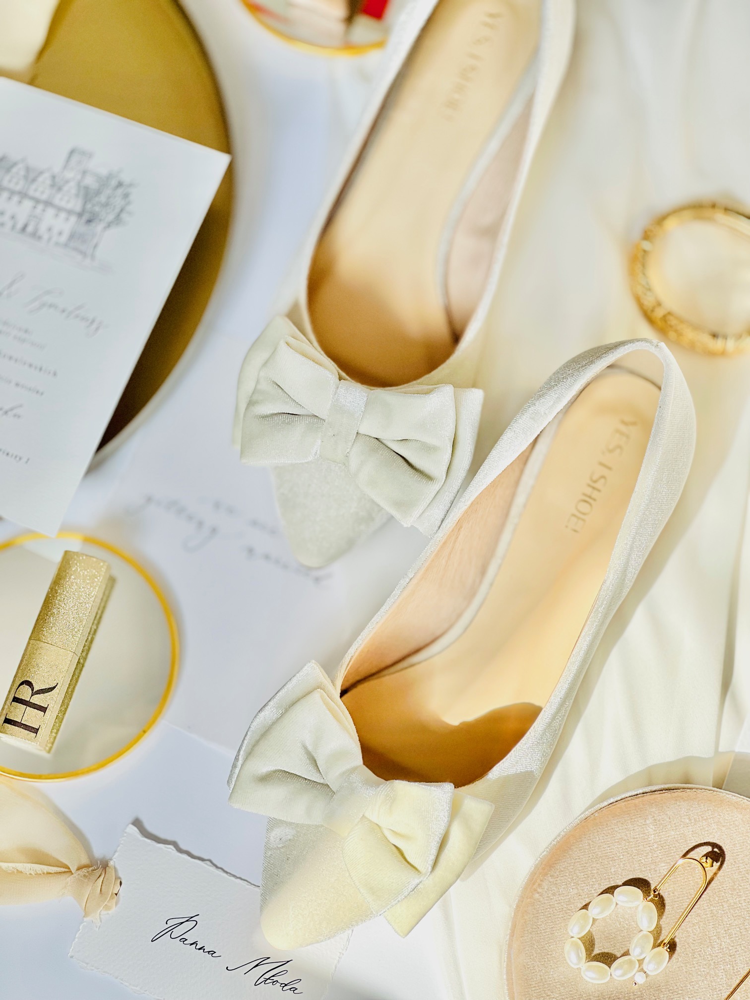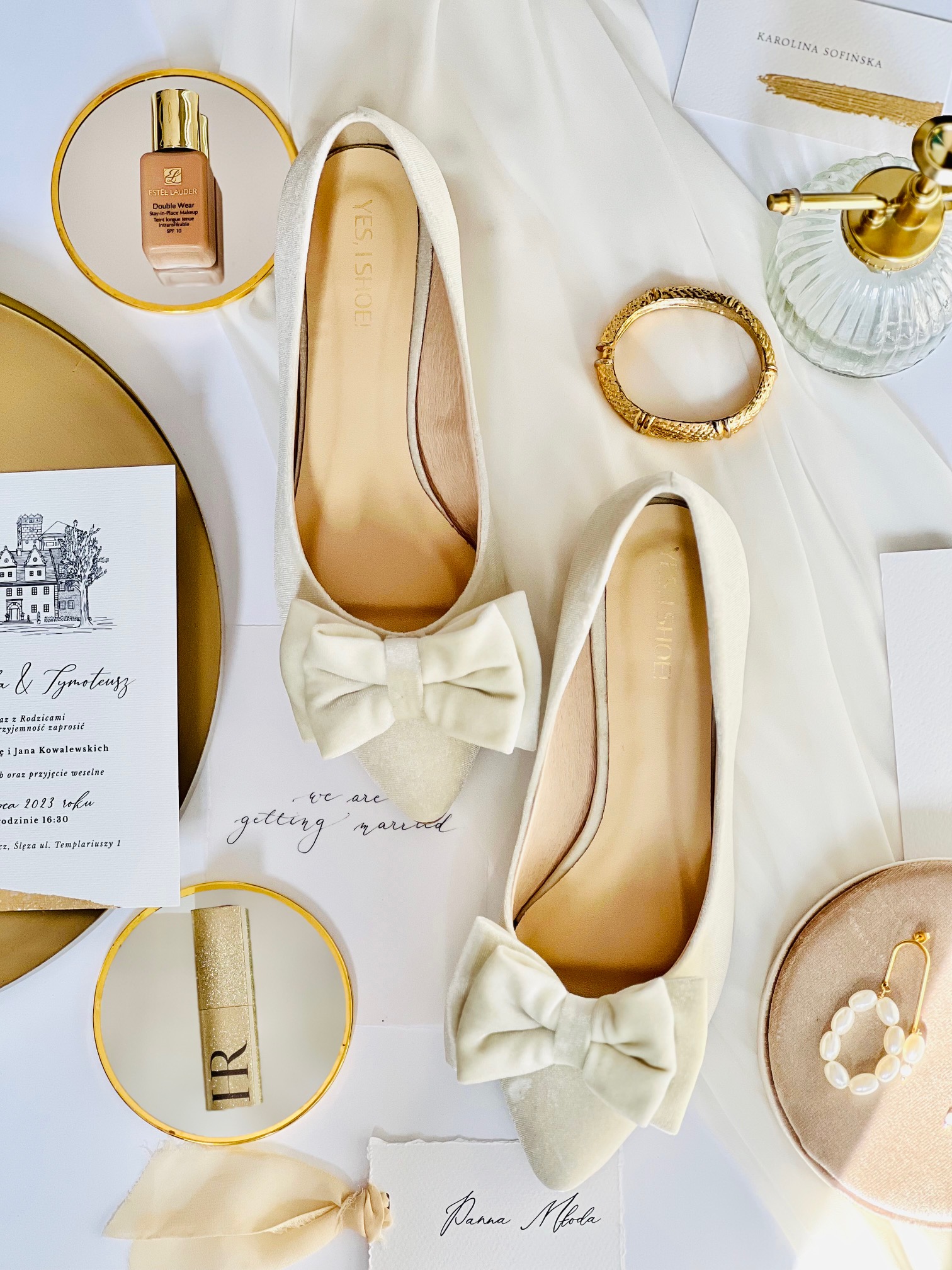 Romantyzmu dodaje kokarda, która dopełni całą stylizację. . Jest wyróżnikiem i dowodem na to, że płaskie buty ślubne mogą być bardzo kobiece.
