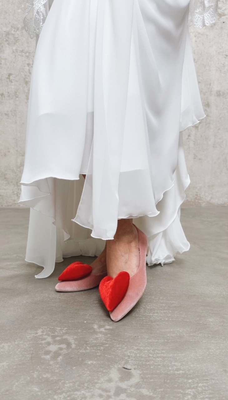Romantyzmu dodaje serce, która dopełni całą stylizację. . Jest wyróżnikiem i dowodem na to, że płaskie buty ślubne mogą być bardzo kobiece.