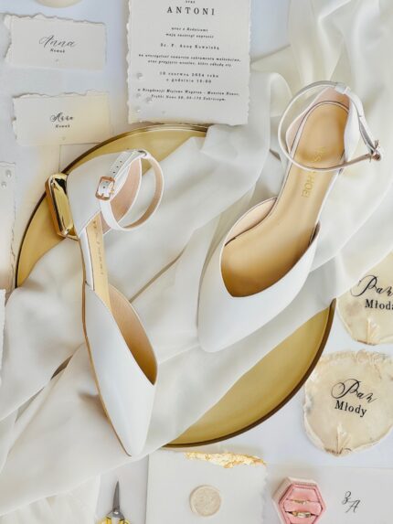Niepowtarzalnym elementem modelu Wanda Ivory jest delikatny, złoty obcas. To właśnie on nadaje baletkom wyjątkowego charakteru, przełamując ich klasyczną formę subtelnym, biżuteryjnym akcentem. Dzięki temu buty nie są jedynie praktycznym dodatkiem, ale stają się elementem stylizacji, który podkreśla wyjątkowość tego jedynego dnia. Złoto doskonale komponuje się z perłami, kryształami czy delikatną biżuterią, tworząc spójną i elegancką całość.