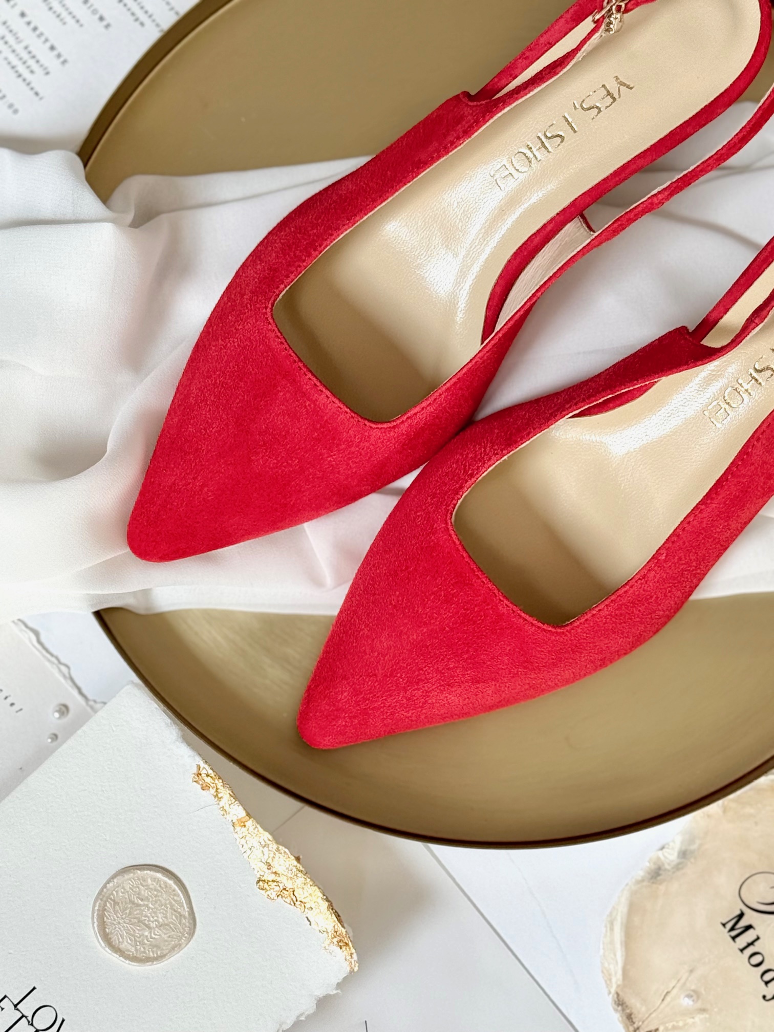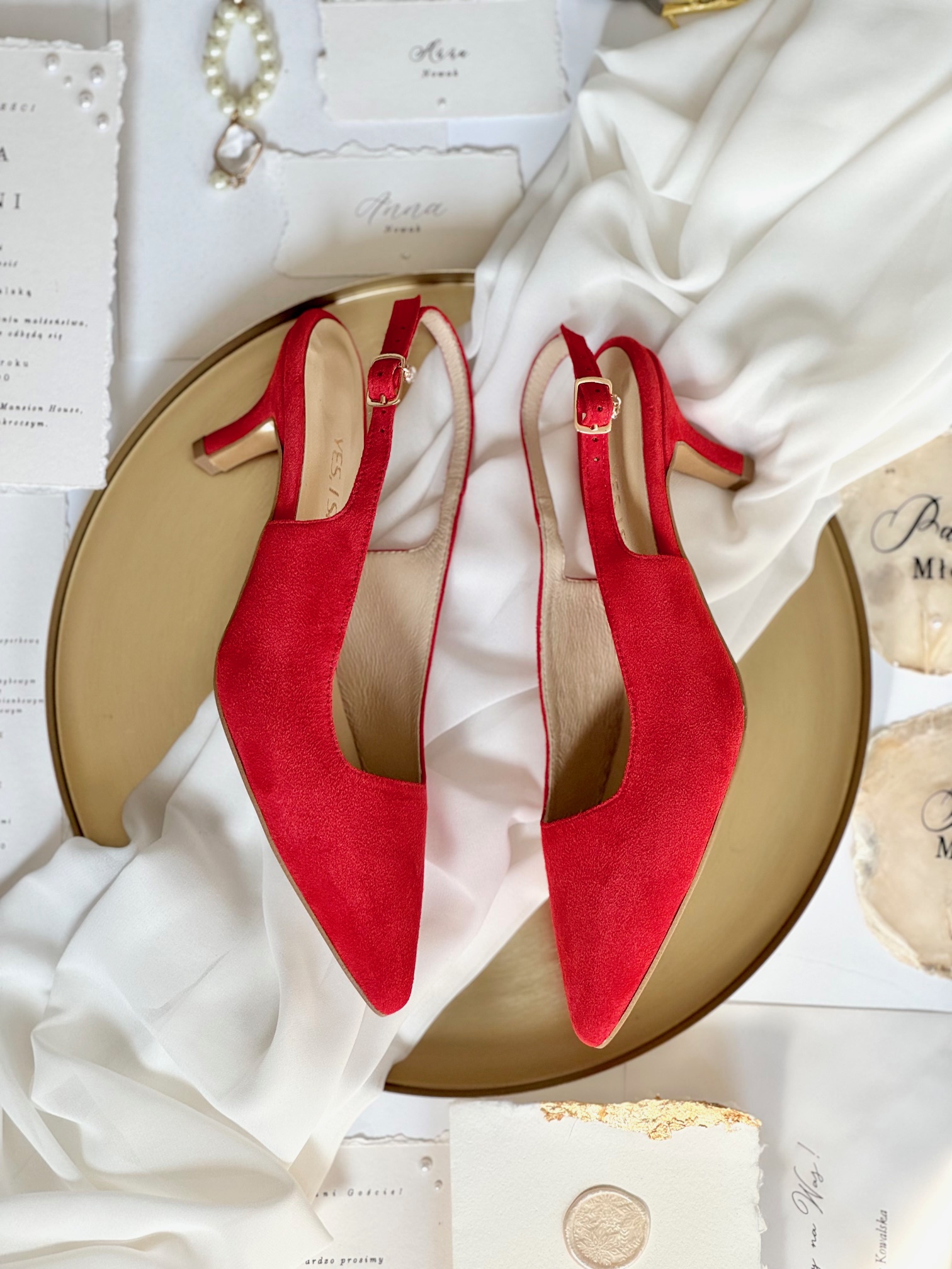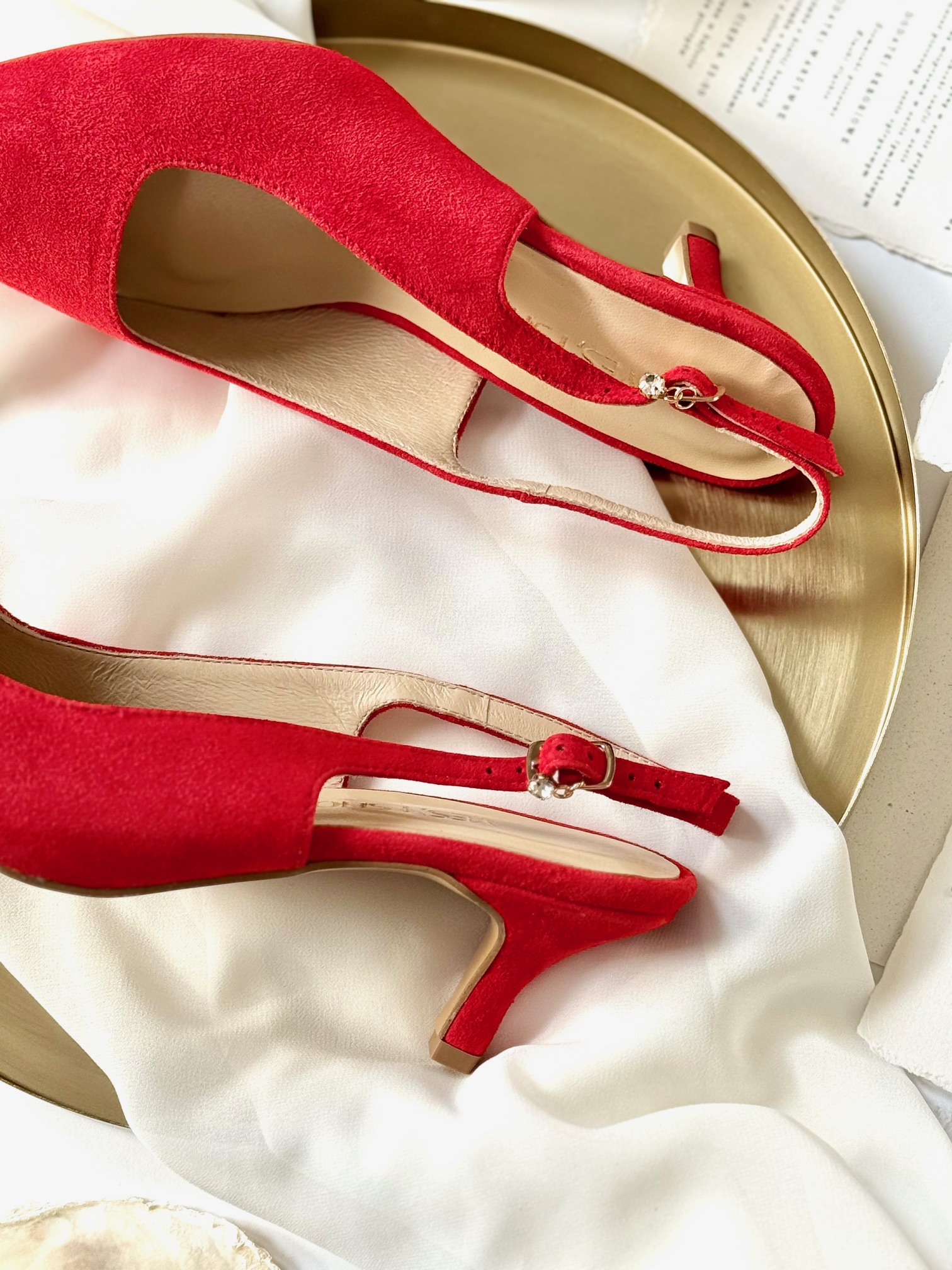 Model Anna Red to buty damskie z kolekcji 2025- SISTERHOOD. Buty na obcasie posiadają nowoczesne wycięcie na pobiciu w kształcie kwadratu, który optycznie wyszczupla naszą sylwetkę.