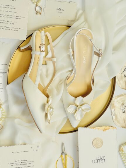 Centralnym akcentem jest kwiatowa ozdoba o rzeźbiarskim kształcie, z perłowym wykończeniem i perłą umieszczoną w samym środku. Ozdoba jest zamontowana na stałe, dzięki czemu wygląda jak naturalna część buta. Jej połysk i pięknie układające się płatki sprawiają, że Apollonia Pearl Flower staje się wyjątkowym, biżuteryjnym elementem stylizacji — takim, który dodaje charakteru bez dominowania nad suknią. Perła w centrum kwiatu subtelnie nawiązuje do tradycji i kobiecego dziedzictwa, które tak często pojawia się w ślubnych opowieściach.