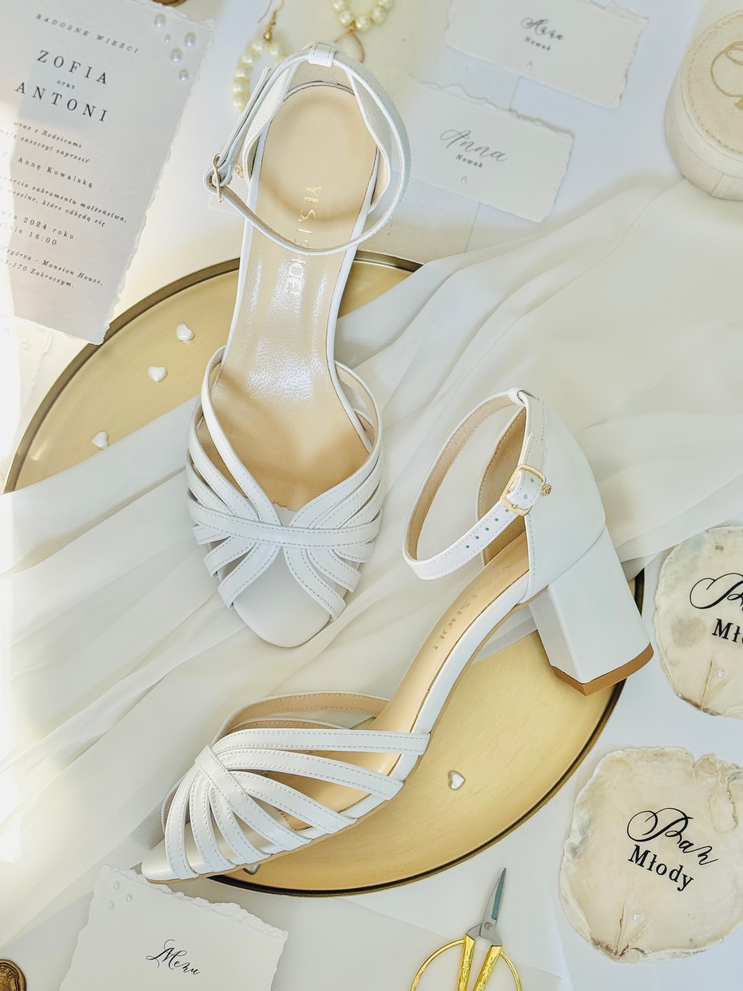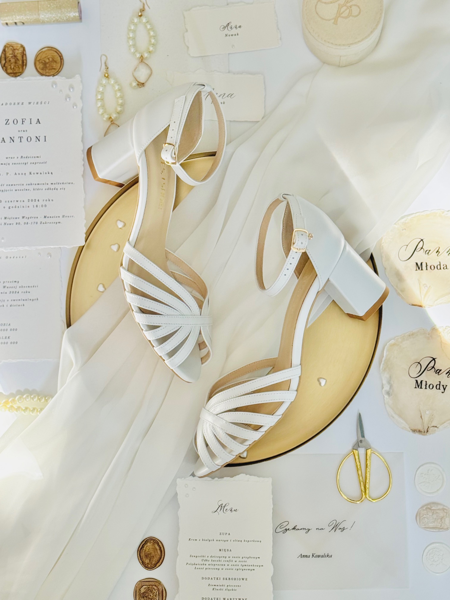 Eleganckie buty ślubne na kopycie tanecznym – komfortowy słupek, skóra licowa w kolorze przełamanej bieli.