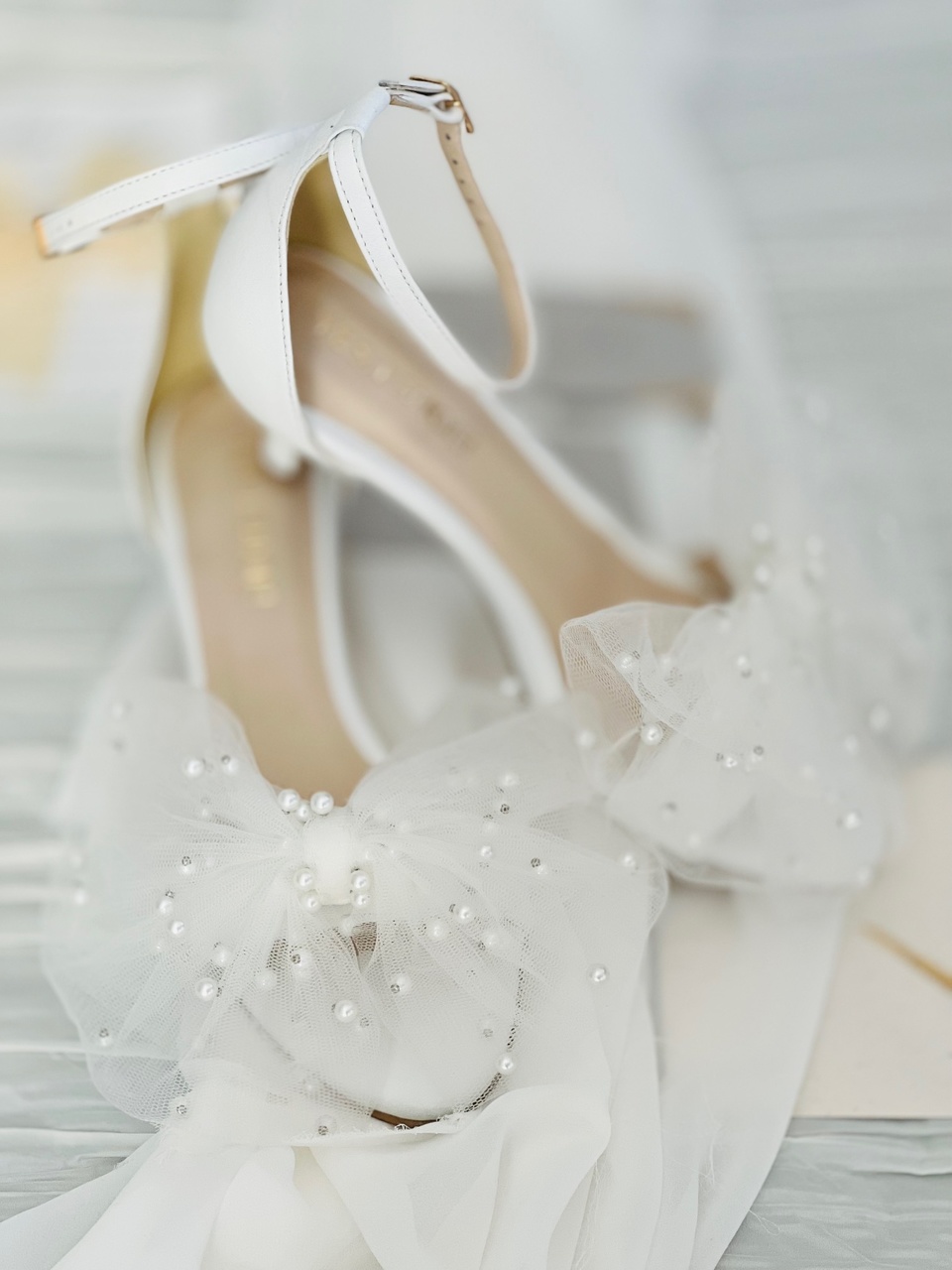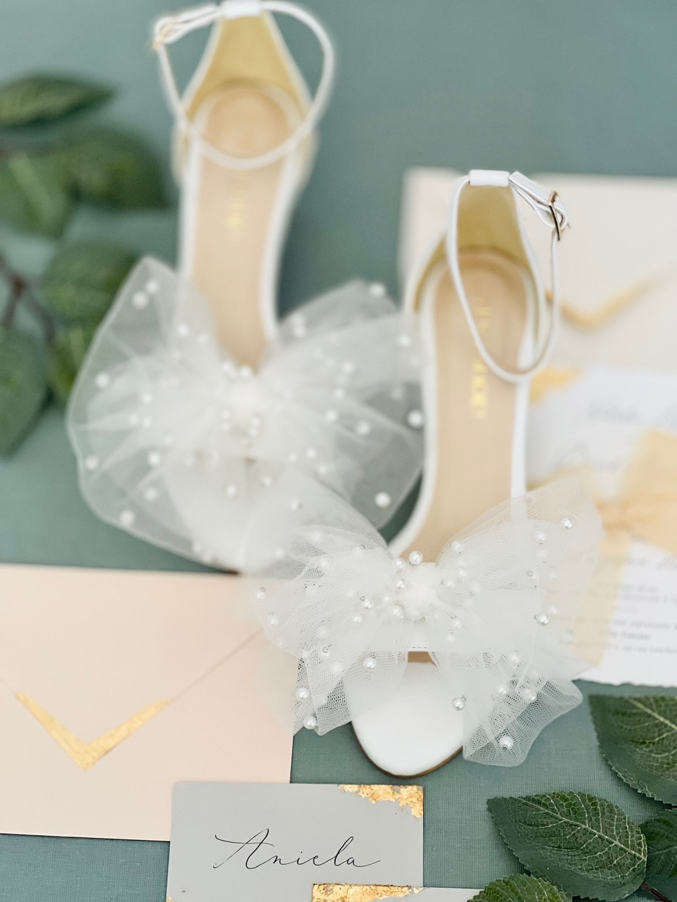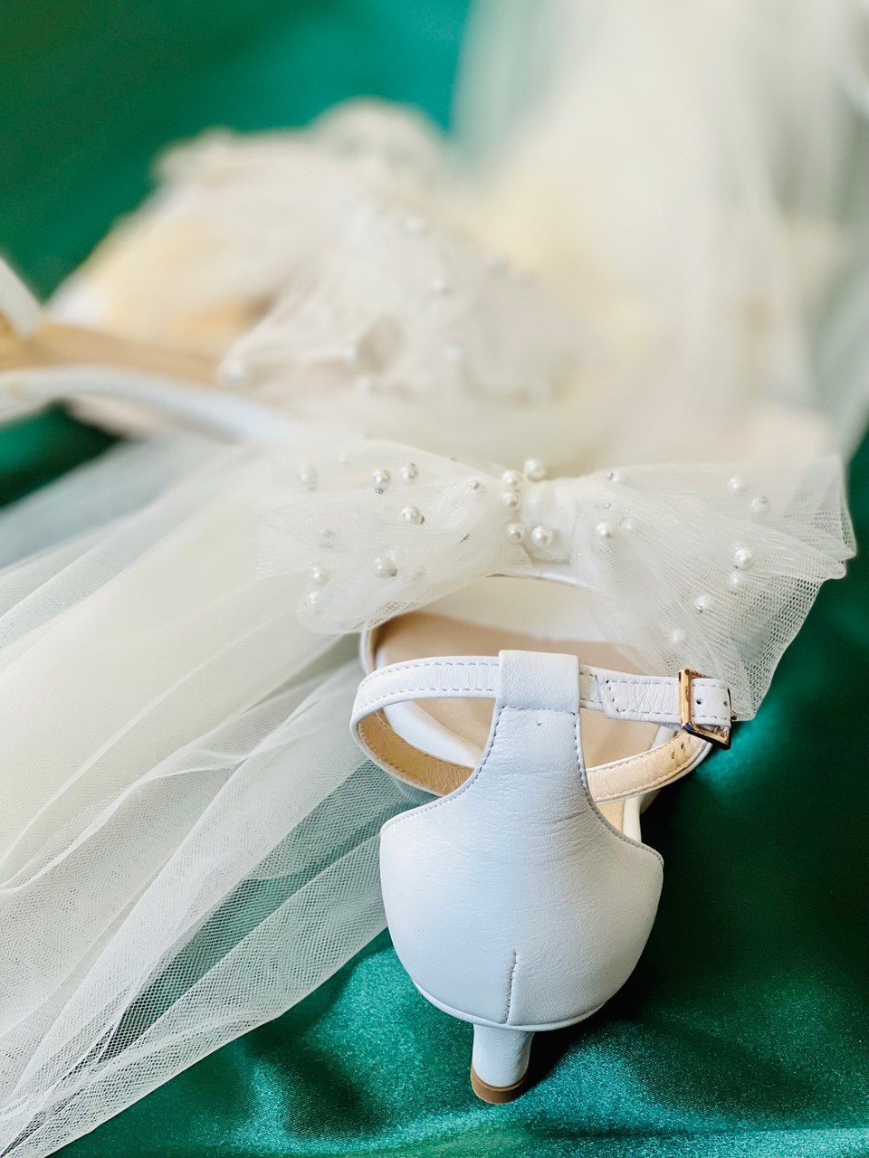 Model Audrey to buty ślubne z kolekcji 2023- I’m every Woman. Sandały ślubne wykonaliśmy w całości z naturalnej, miękkiej skóry licowej w kolorze przełamanej bieli. Buty ślubne wyróżnia duża, ręcznie szyta, tiulowa kokarda z perłami.
