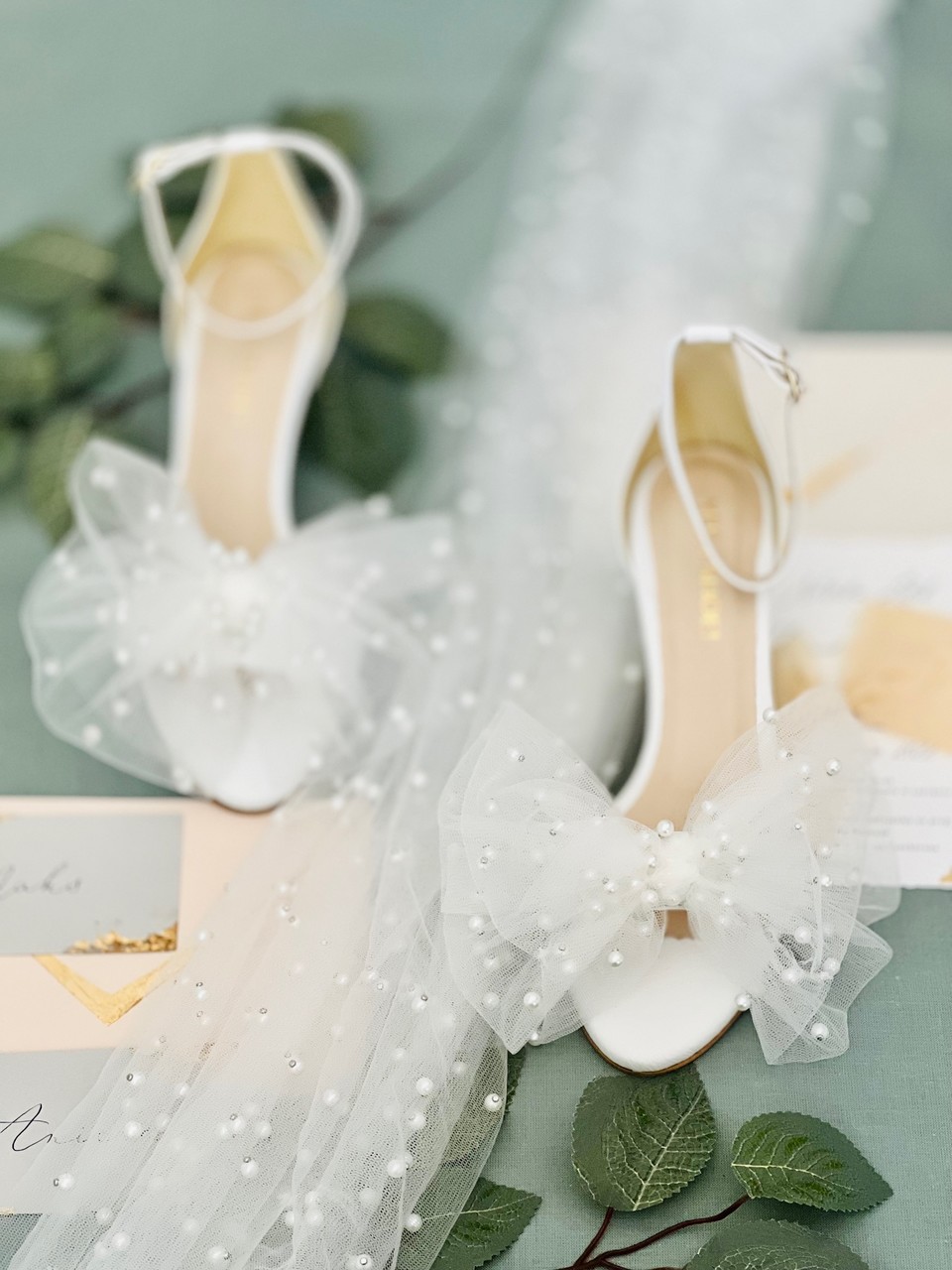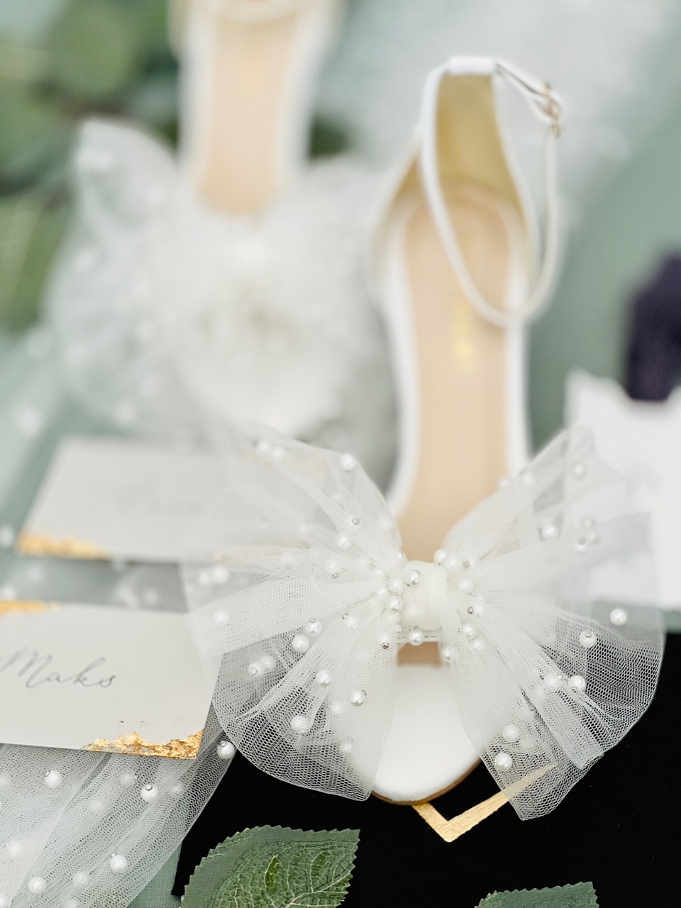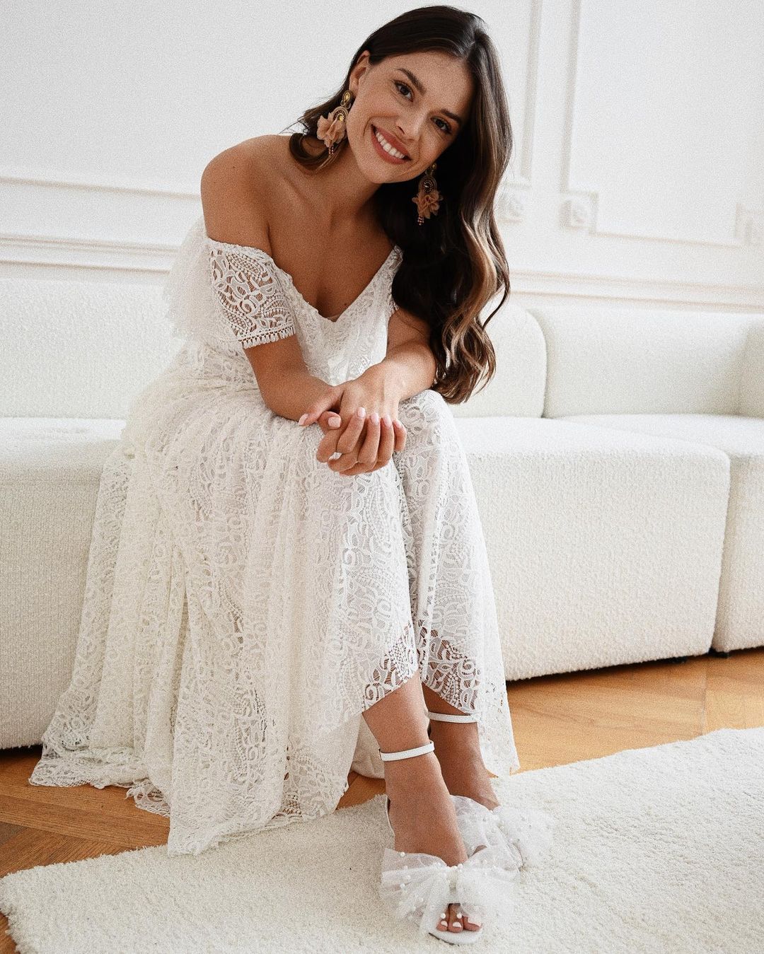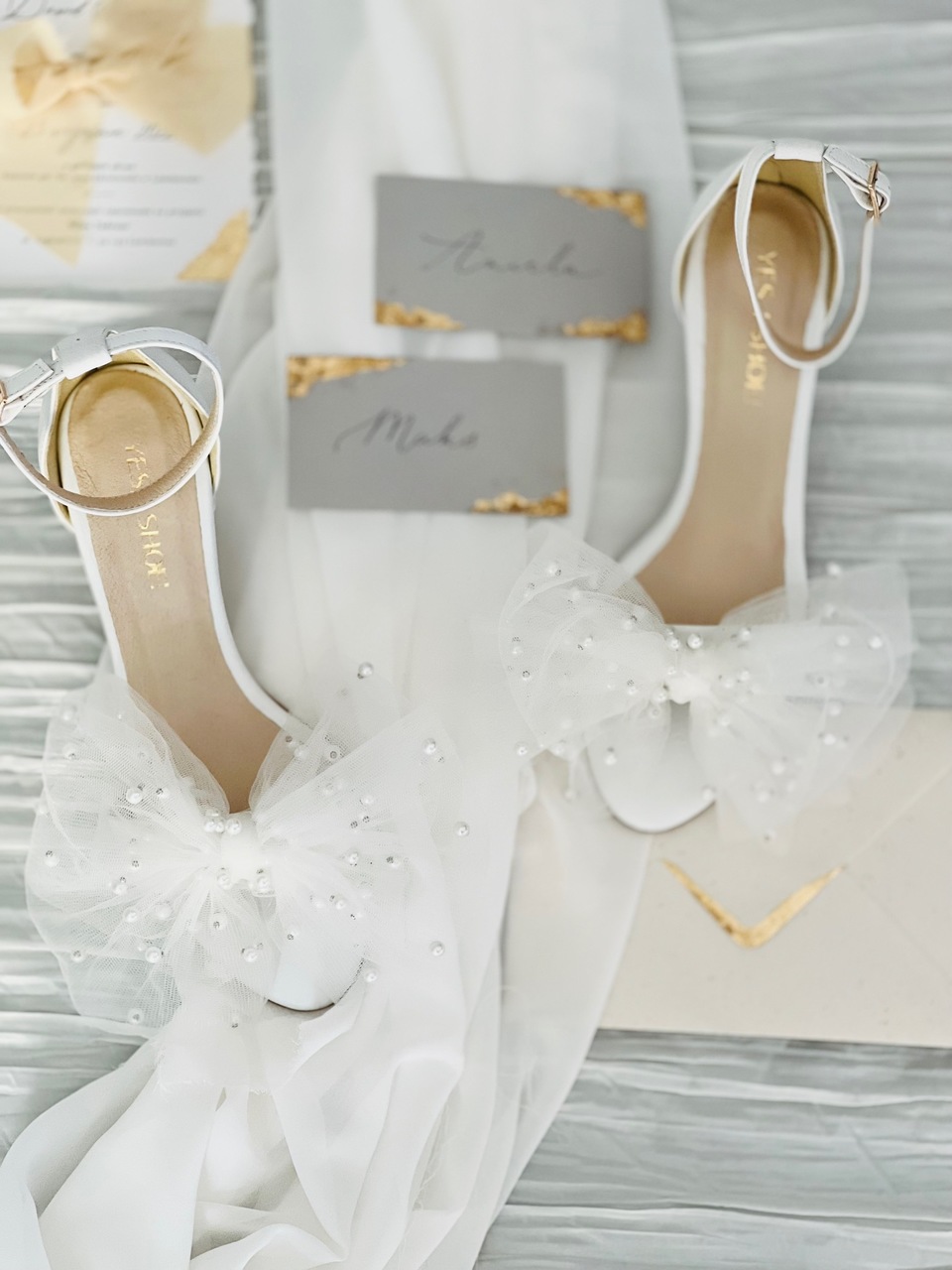 Model Audrey to buty ślubne z kolekcji 2023- I’m every Woman. Sandały ślubne wykonaliśmy w całości z naturalnej, miękkiej skóry licowej w kolorze przełamanej bieli. Buty ślubne wyróżnia duża, ręcznie szyta, tiulowa kokarda z perłami.