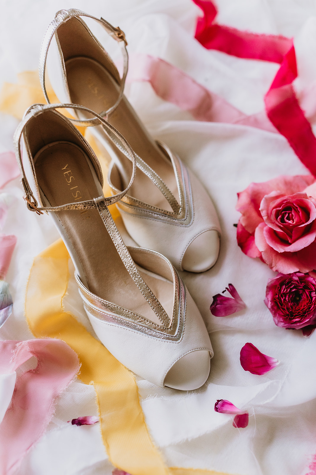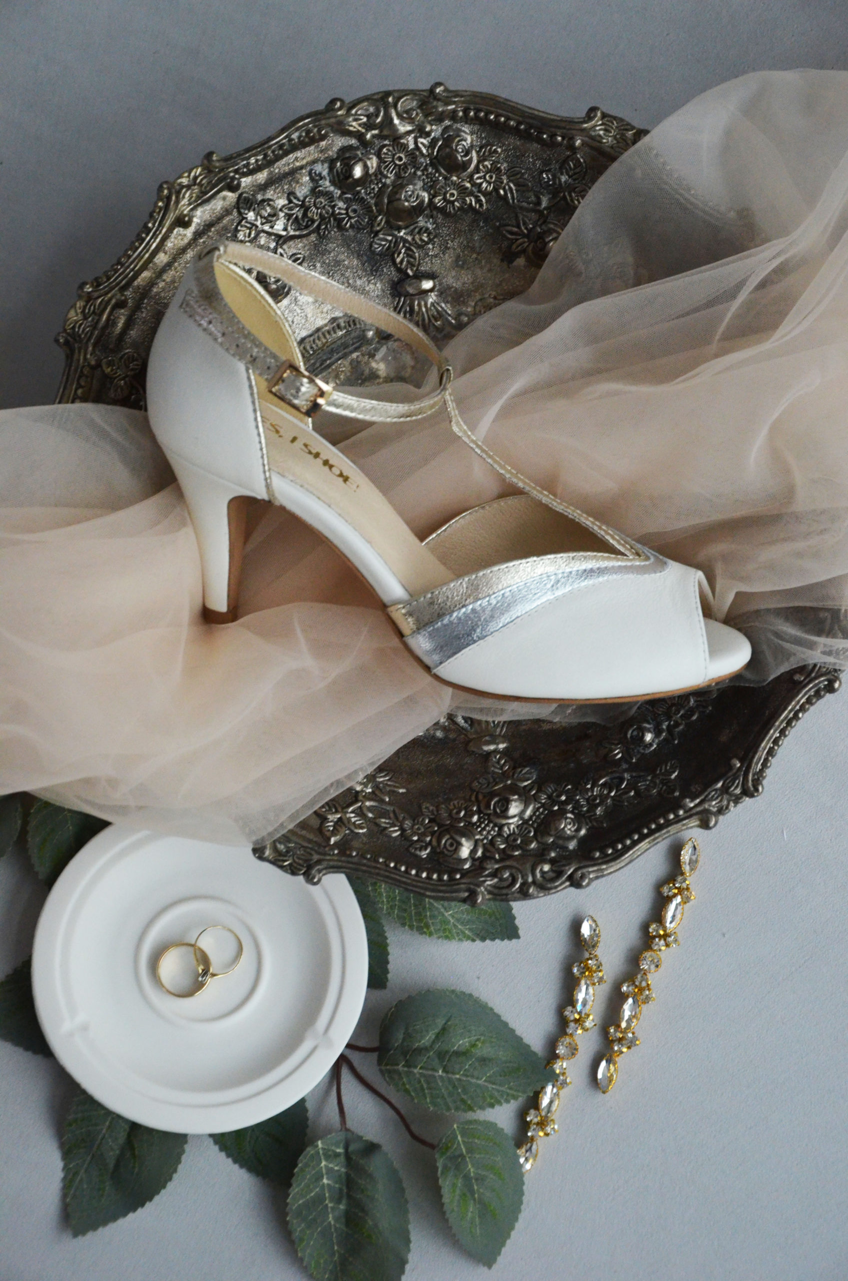 Bita śmietana to buty ślubne w których zakocha się każda zwolenniczka klasycznego wyglądu. Naturalna skóra w kolorze Ivory, a do tego paseczki w kolorze złota oraz srebra.