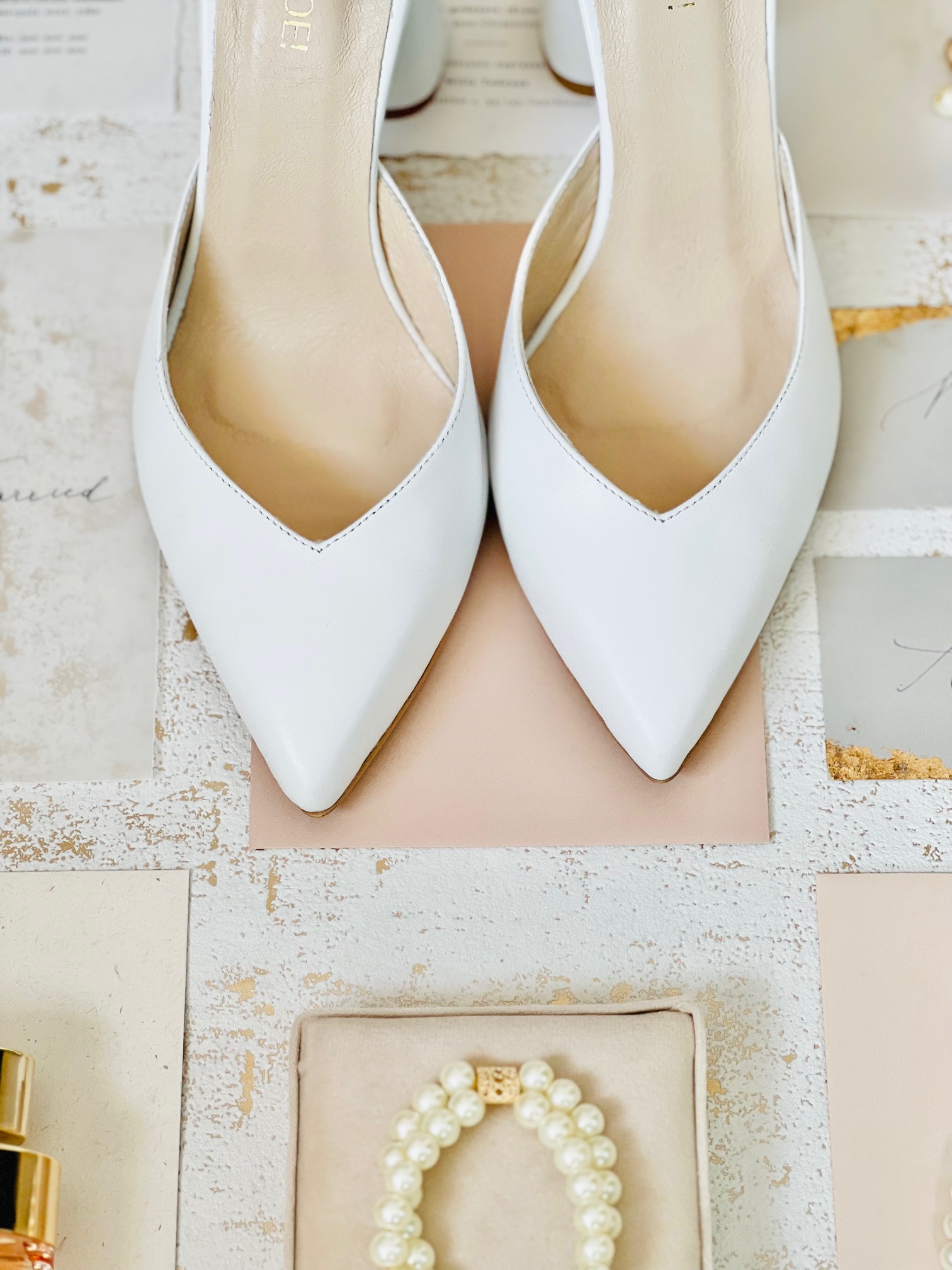 Model Eva to buty ślubne z kolekcji 2023- I’m every Woman. Czółenka ślubne wykonaliśmy w całości z naturalnej, miękkiej skóry licowej w kolorze przełamanej bieli. Buty ślubne wyróżnia zabudowany nosek wycięty w szpic, co optycznie wydłuży sylwetkę.