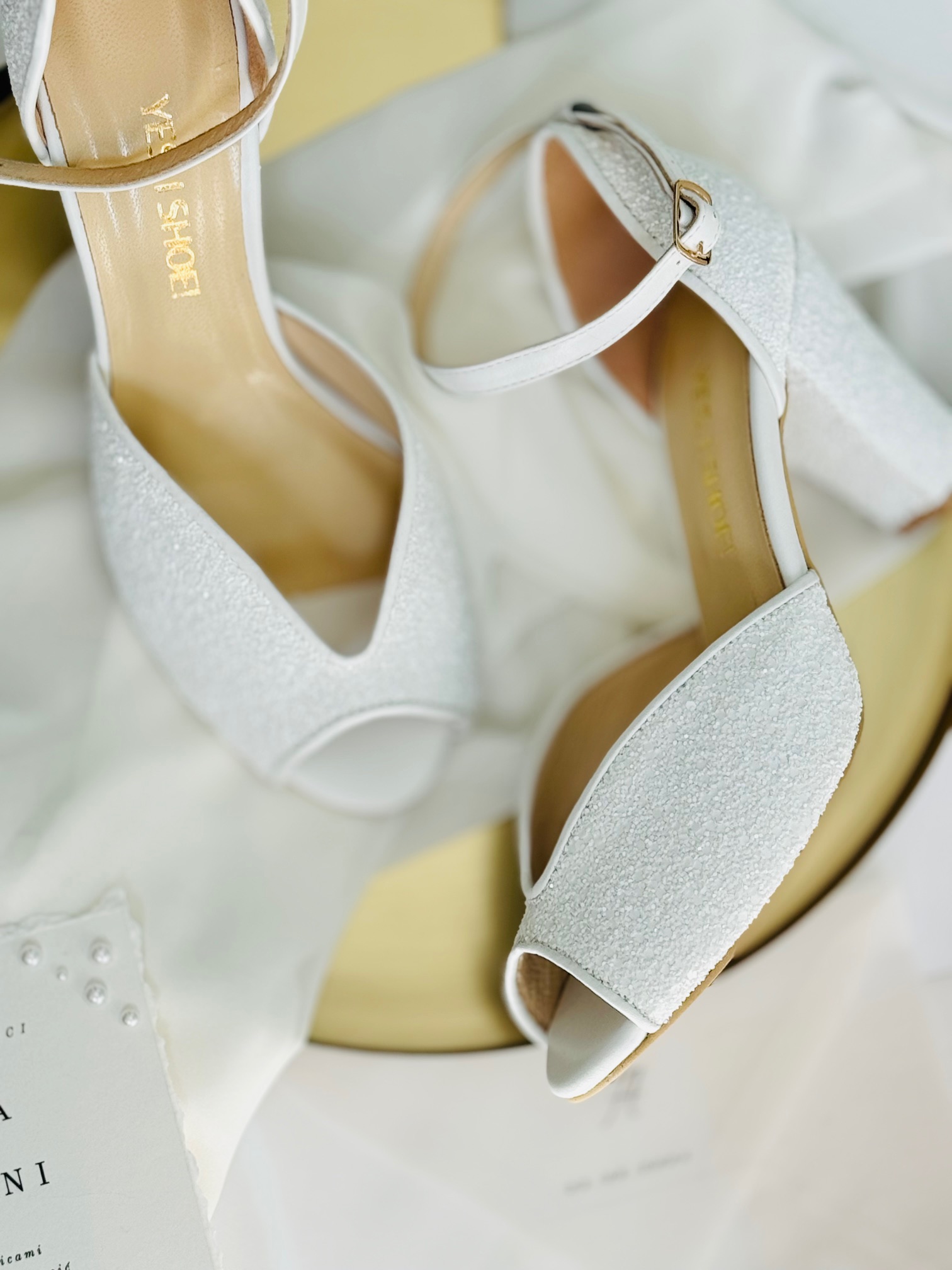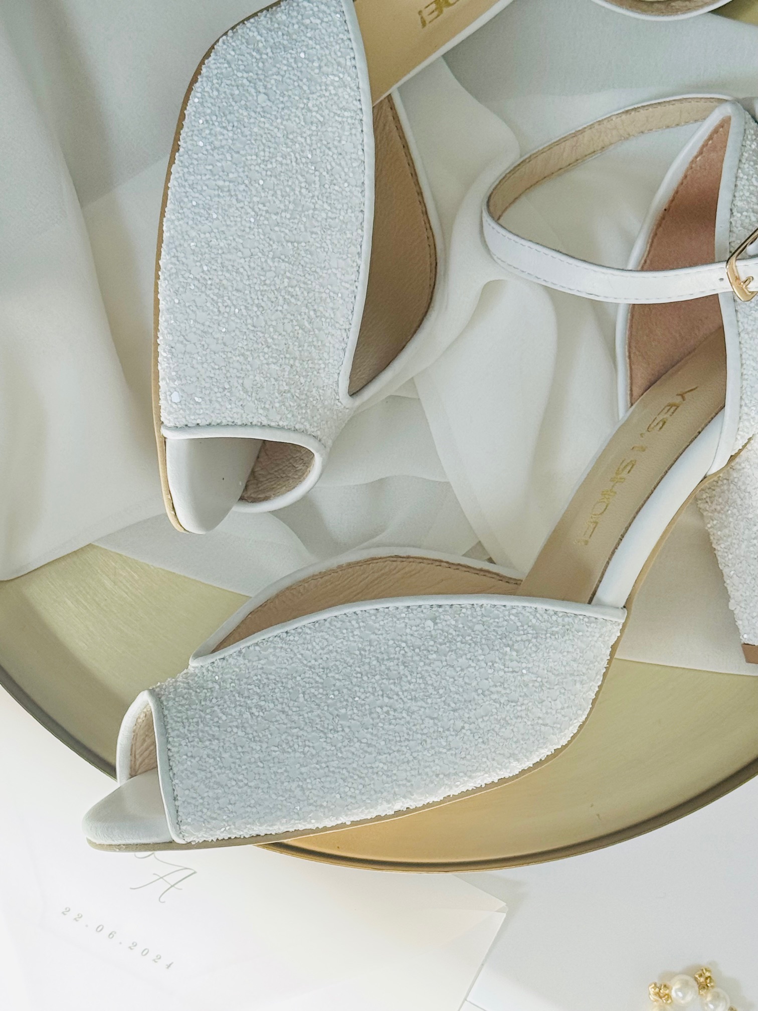 Buty ślubne Frances zostały wykonane na kopycie tanecznym, które doskonale zabezpiecza stopę podczas tańca. Biały, gruboziarnisty brokat pięknie pracuje ze światłem, a skórzane wnętrze buta zapewni Ci komfort przez całą noc. Obcas w kształcie słupka o wysokości ok 8 cm dodaje elegancji i podkreśla kobiecą sylwetkę.