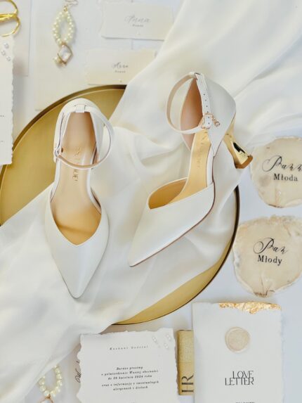 Warto zwrócić uwagę na konstrukcję buta – osobno zaprojektowany przód i osobno zapiętek sprawiają, że całość wygląda lekko i smukło, a jednocześnie doskonale trzyma się stopy. Pasek wokół kostki stanowi nie tylko ozdobny akcent, ale przede wszystkim stabilizuje stopę, zapobiegając zsuwaniu się buta podczas tańca czy długiego spaceru do ołtarza.