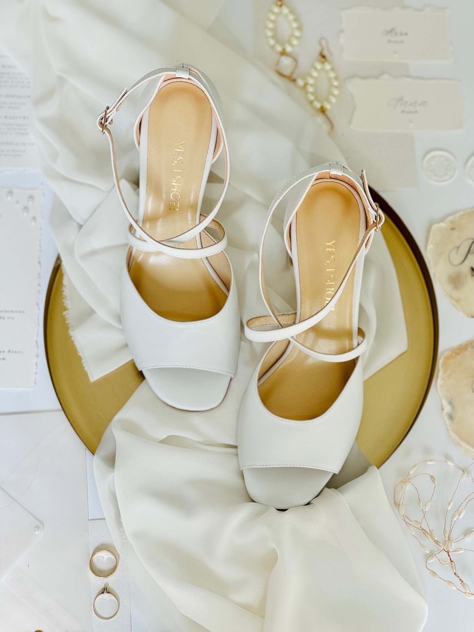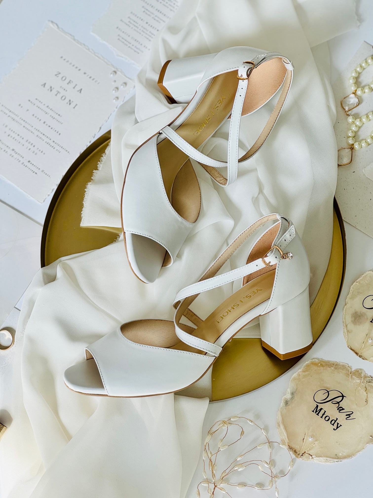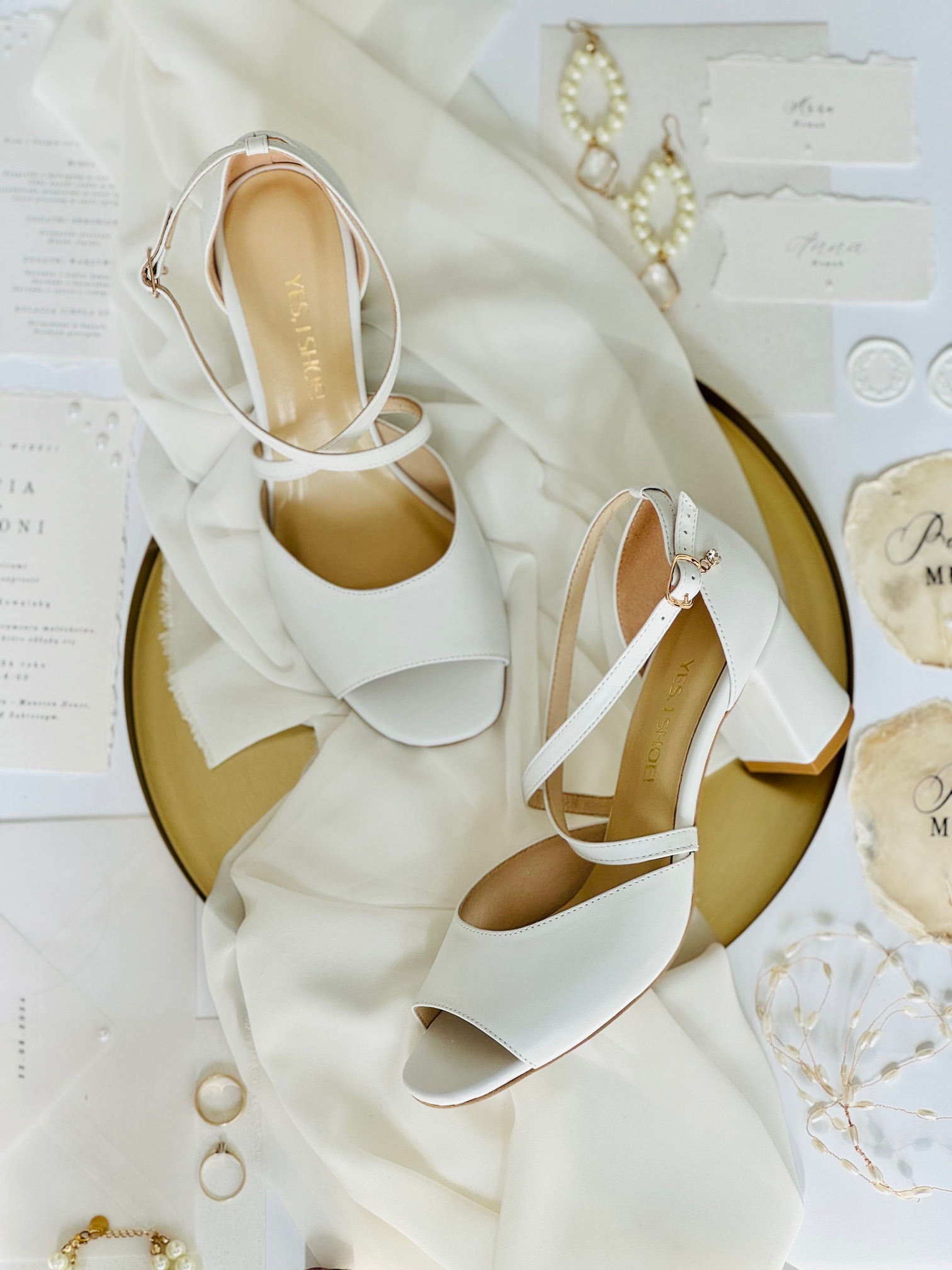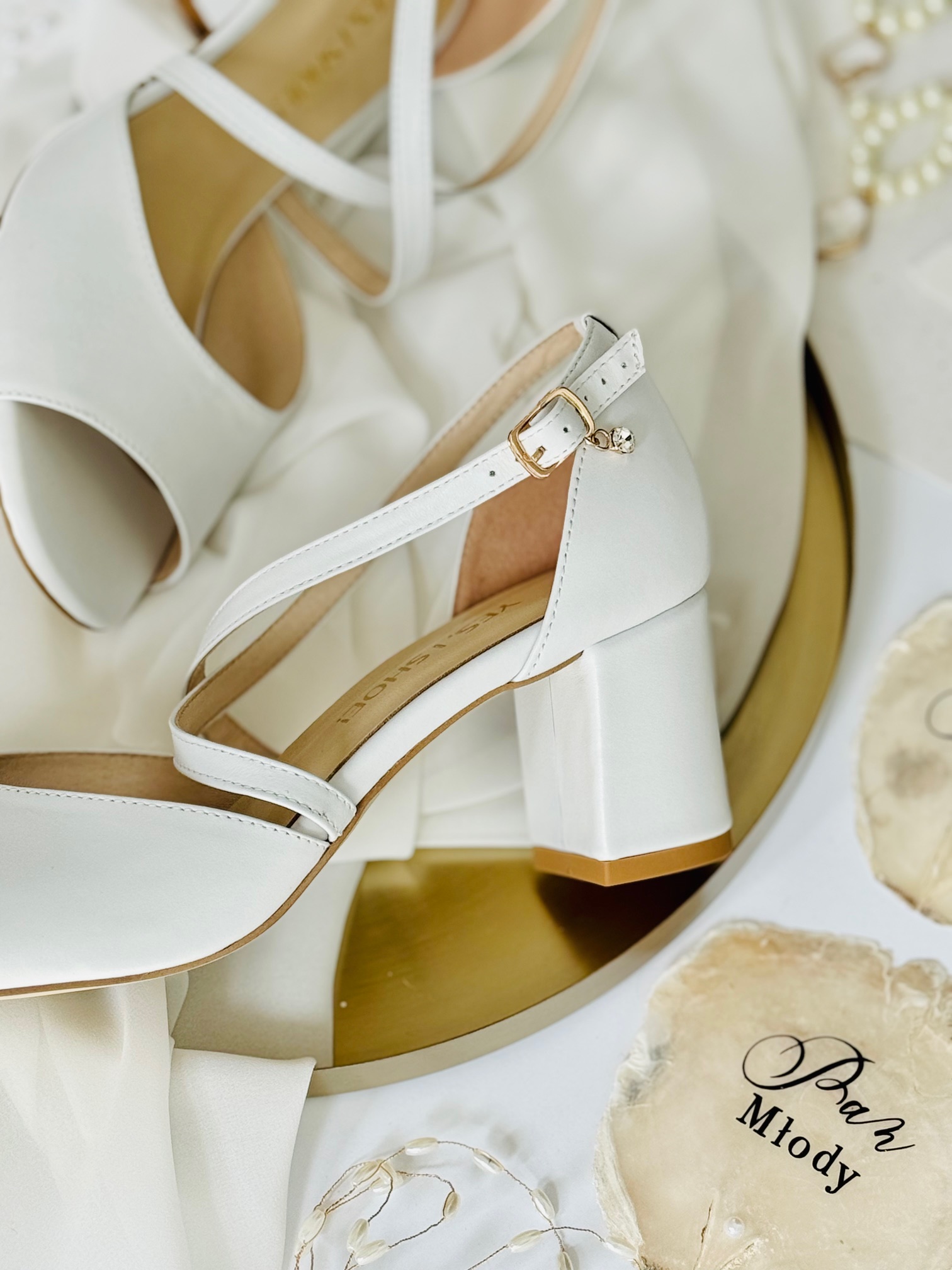 Buty Clara Ivory są wykonane z wysokiej jakości skóry licowej w eleganckim odcieniu przełamanej bieli, który doskonale komponuje się z różnymi stylami sukien ślubnych. Ich obcas w kształcie słupka o wysokości ok 6,5 cm zapewnia stabilność i komfort przez cały dzień..