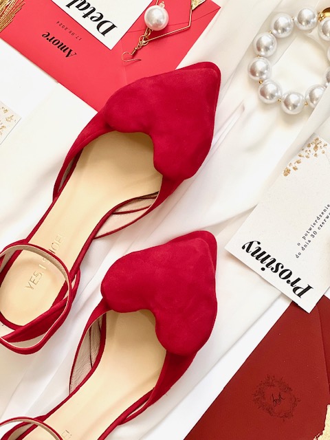 1 opinia dla AMORE FLAT Czerwone zamszowe baleriny z serduszkiem w szpic z paskiem
