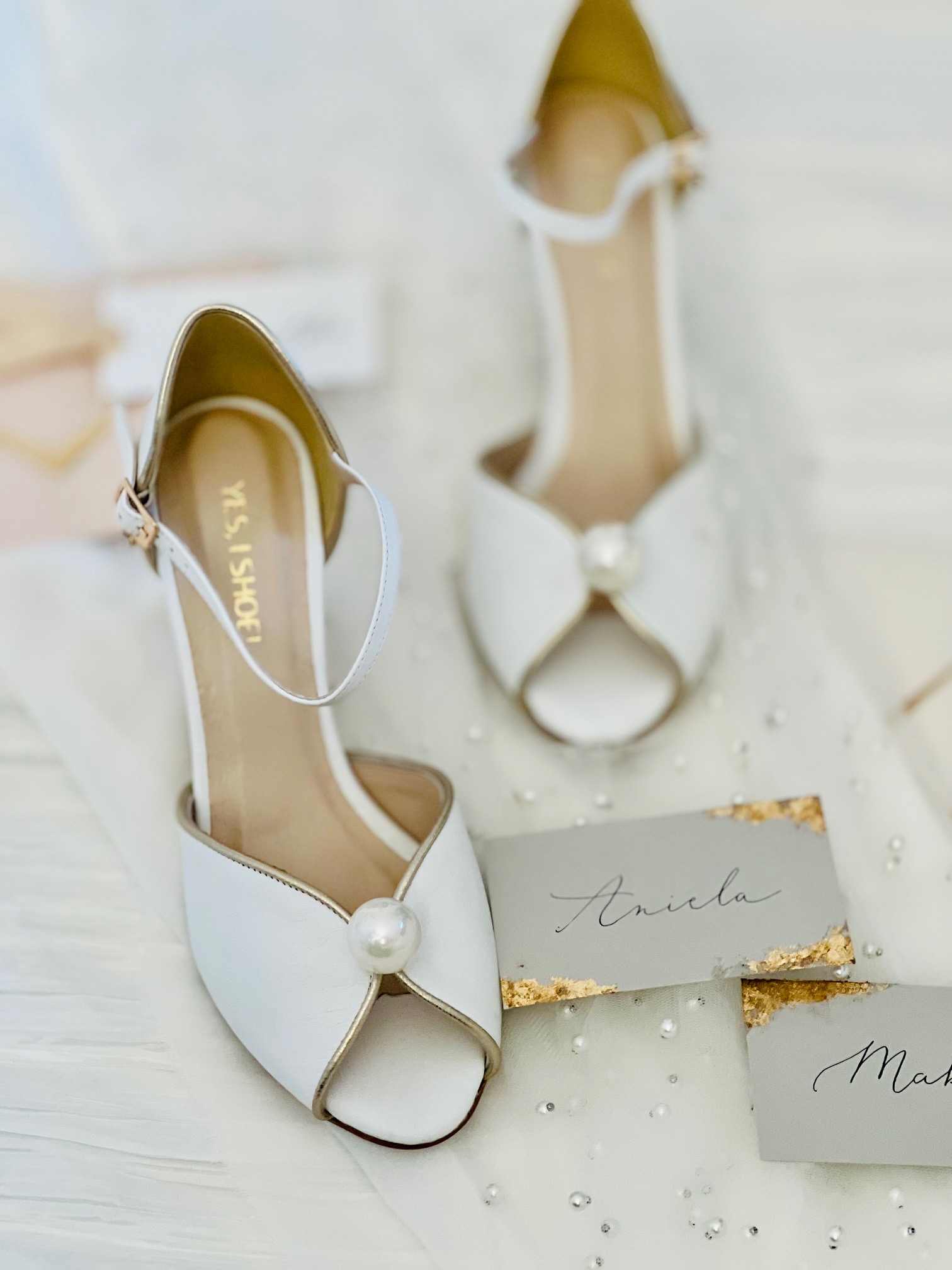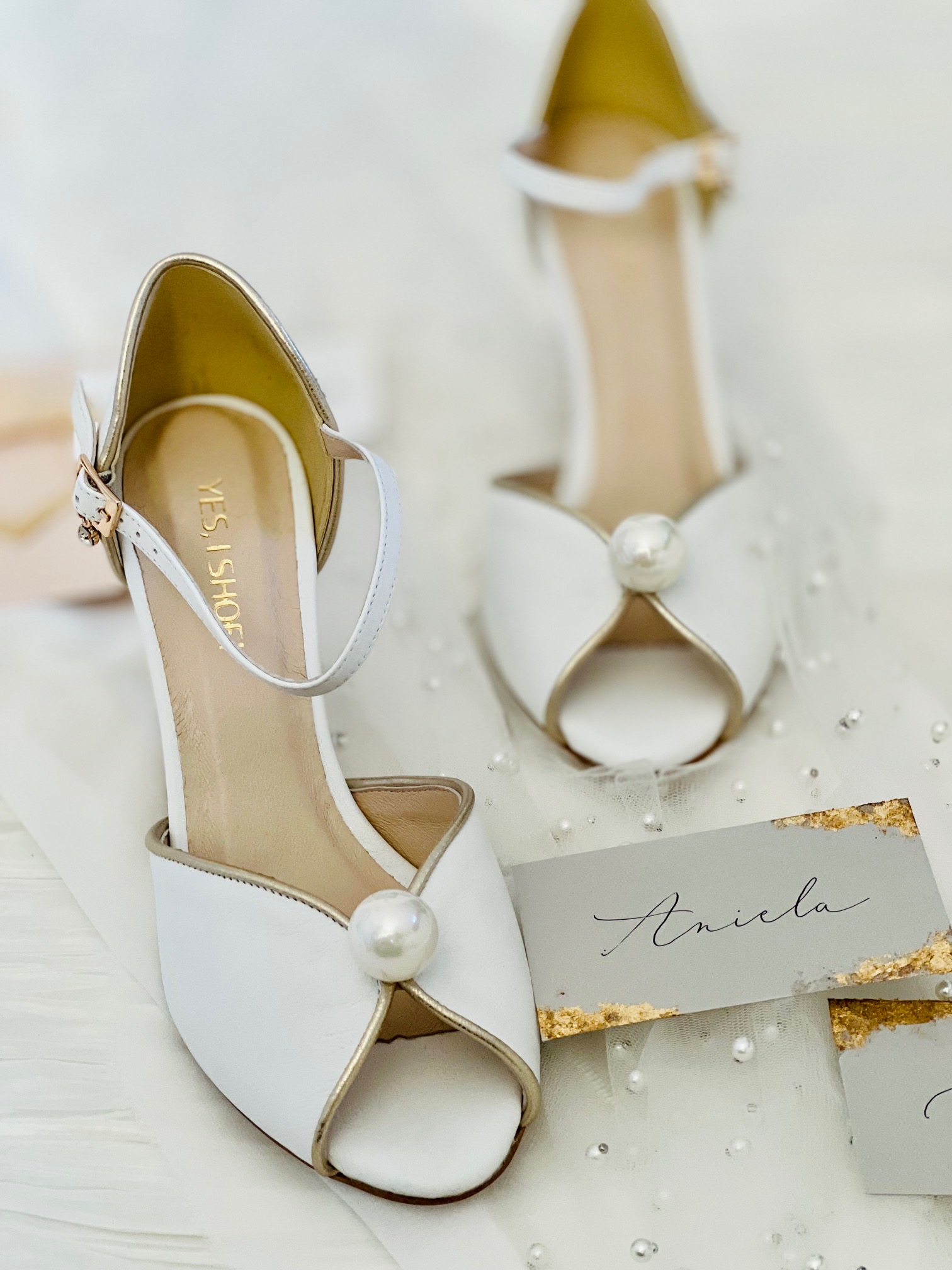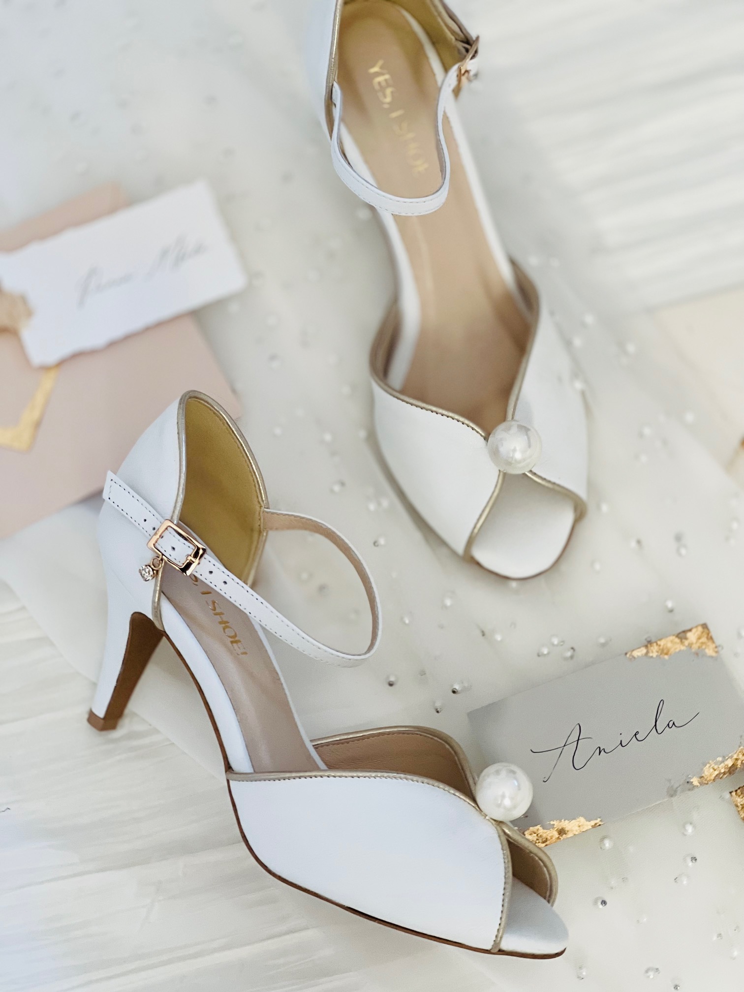 Buty ślubne zostały wykonane ze skóry licowej w kolorze przełamanej bieli. Obszycia wykonaliśmy ze skóry w kolorze złotym, który dodaje im elegancji i dostojności. Buty zostały ozdobione dużą perłą, co sprawia, że mają nietuzinkowy wygląd. Obcas szpilka o wysokości 8 cm zapewni komfort noszenia przez całą noc.