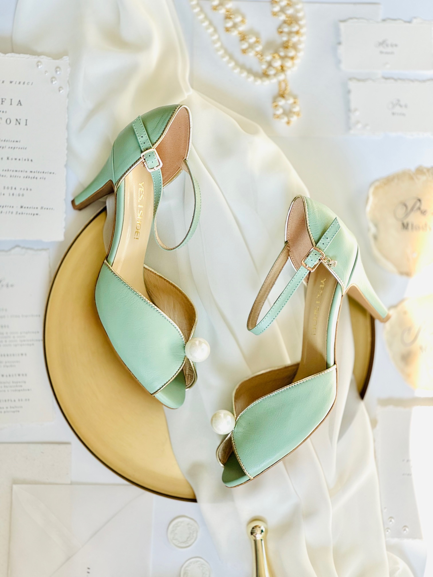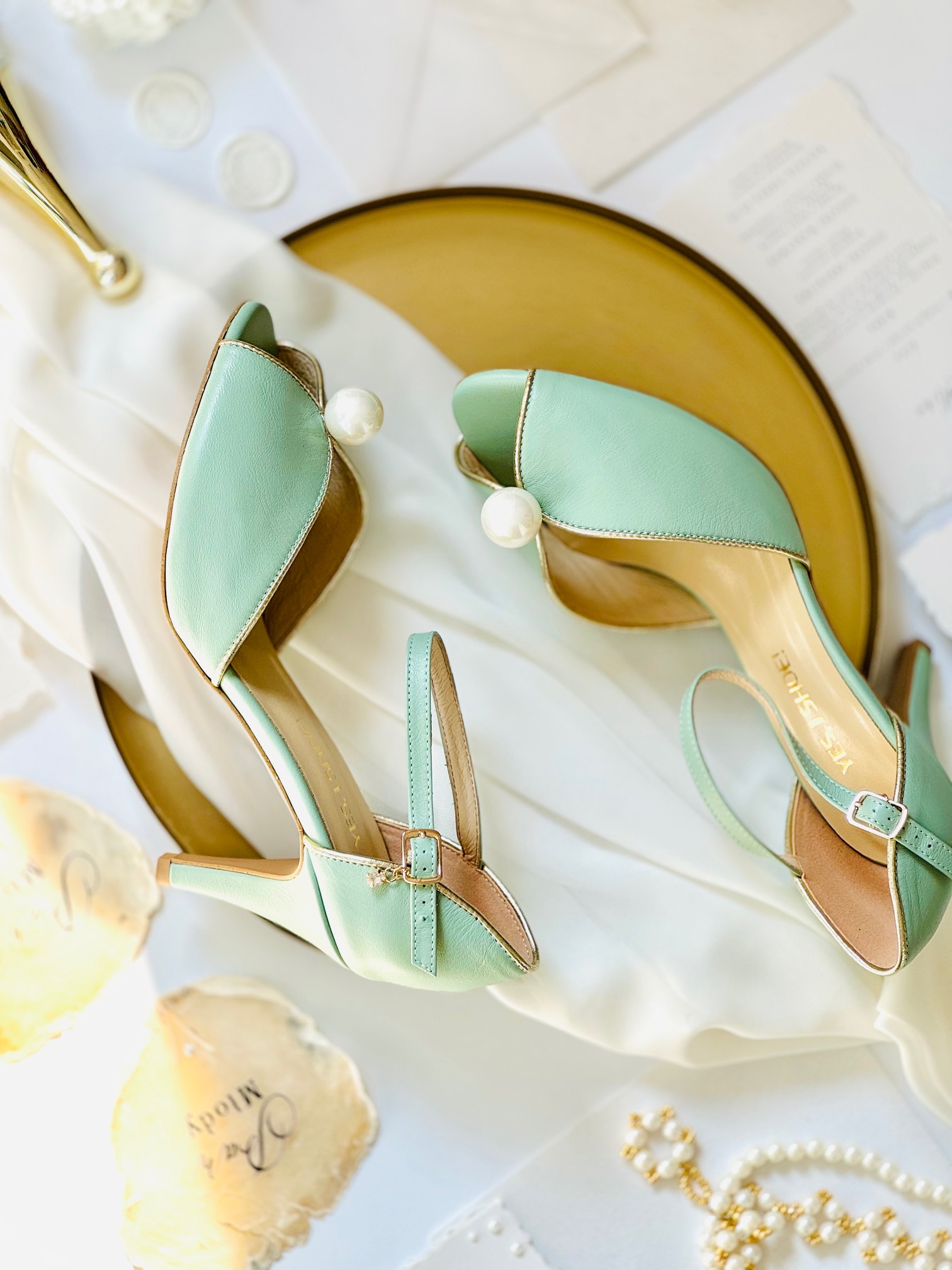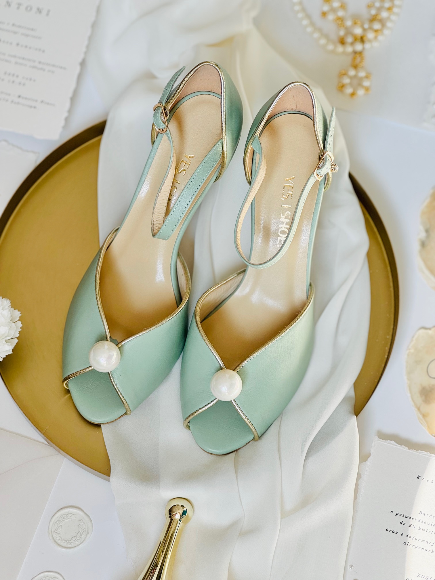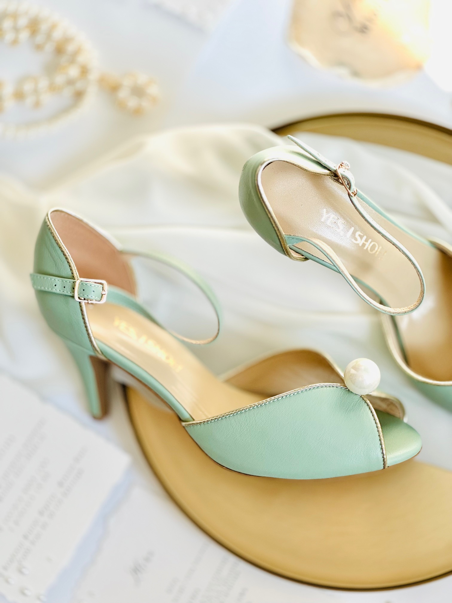 Buty damskie zostały wykonane ze skóry licowej w kolorze szałwii. Obszycia wykonaliśmy ze skóry w kolorze złotym, który dodaje im elegancji i dostojności. Buty zostały ozdobione dużą perłą, co sprawia, że mają nietuzinkowy wygląd. Obcas szpilka o wysokości 8 cm zapewni komfort noszenia przez całą noc.