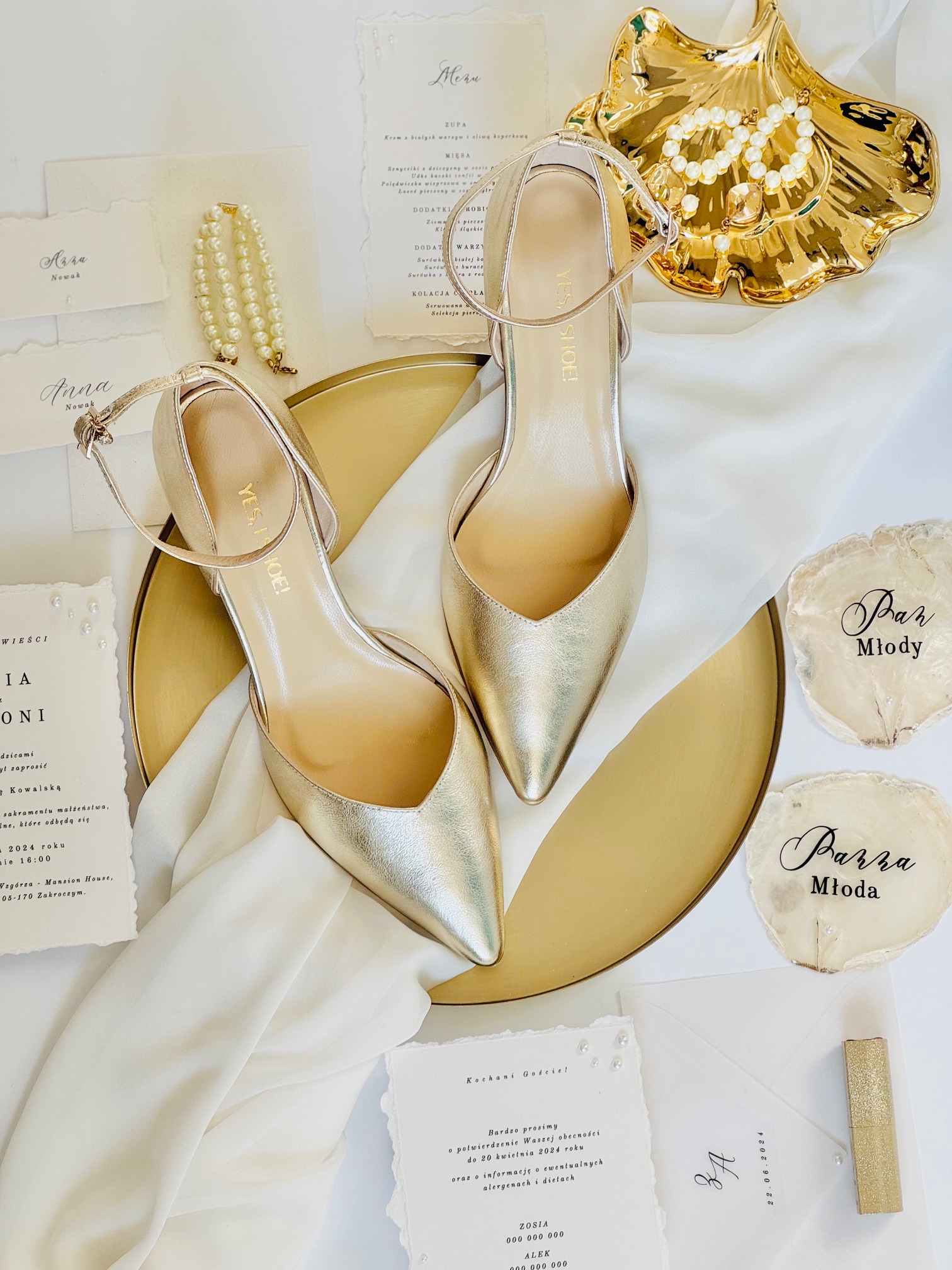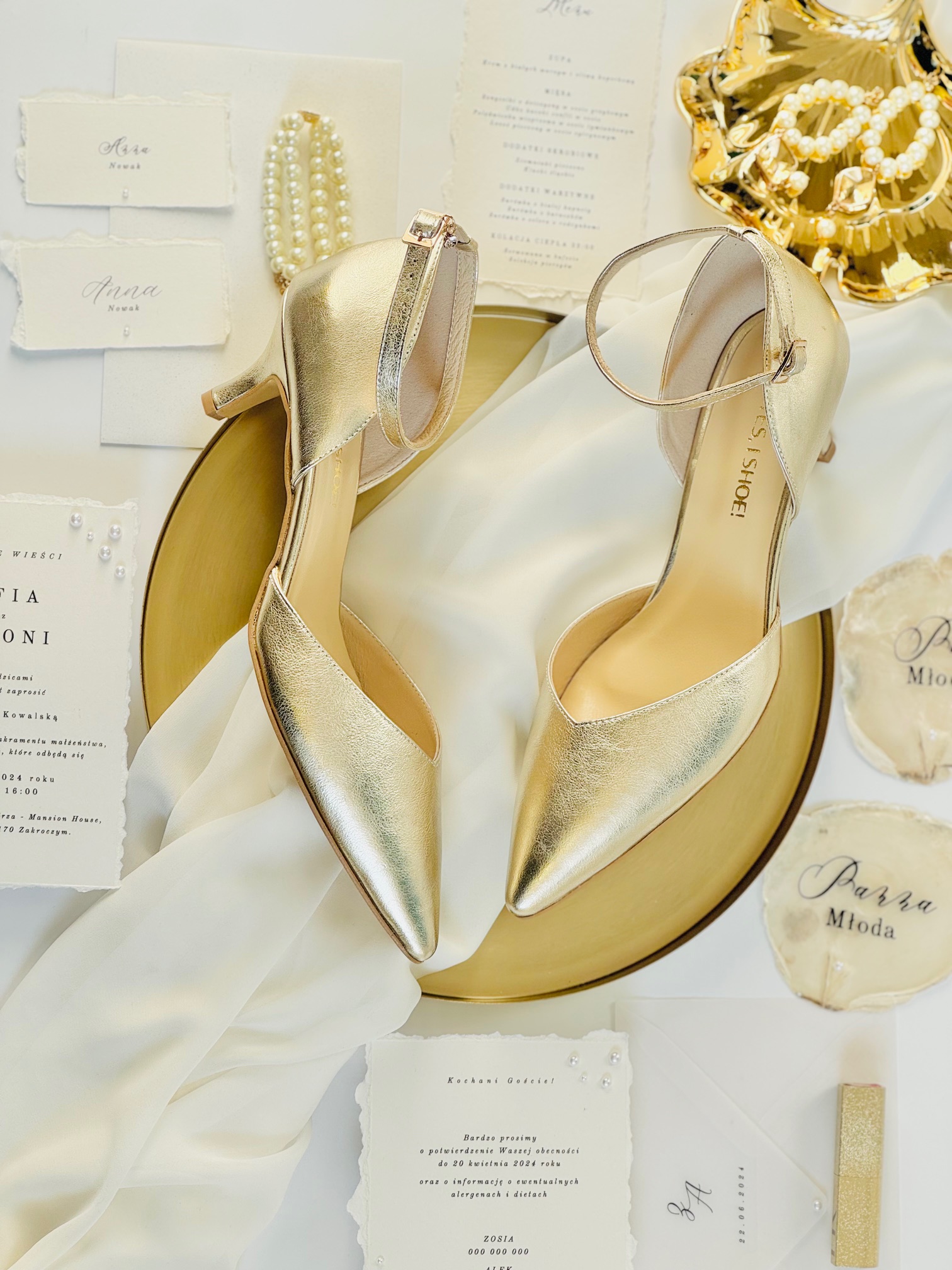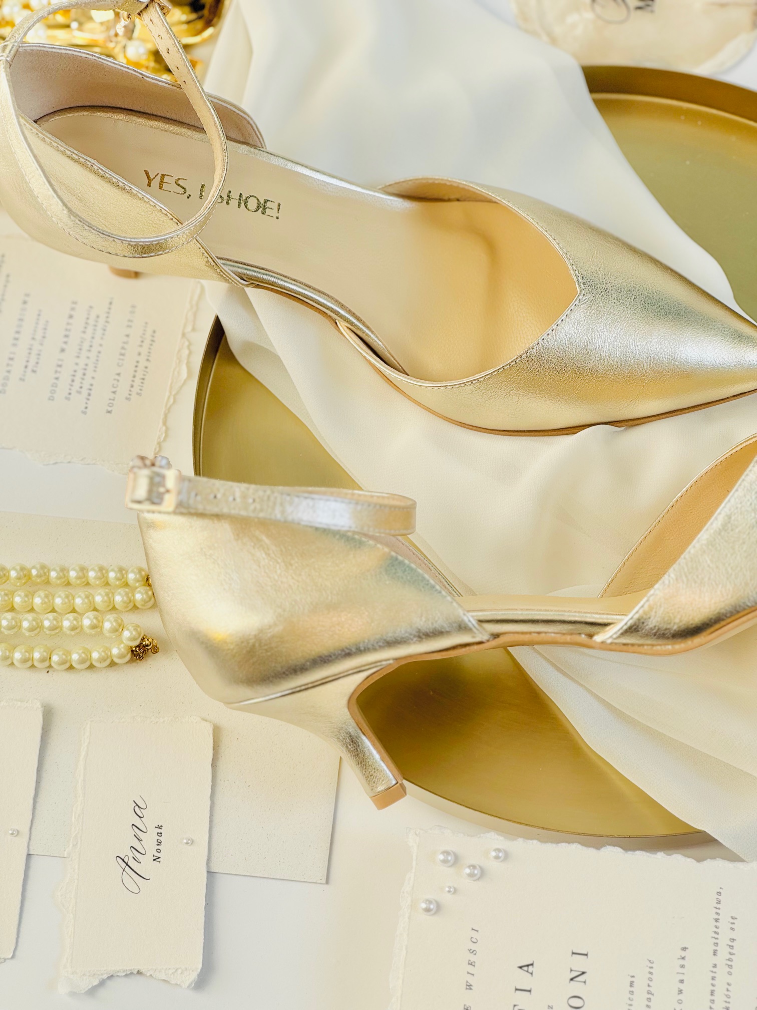 Model Eliza Gold to buty ślubne z kolekcji 2025- SISTERHOOD. Czółenka ślubne wykonaliśmy z naturalnej, miękkiej skóry licowej w kolorze złotym. Buty ślubne wyróżnia zabudowany nosek wycięty w szpic, co optycznie wydłuży sylwetkę.