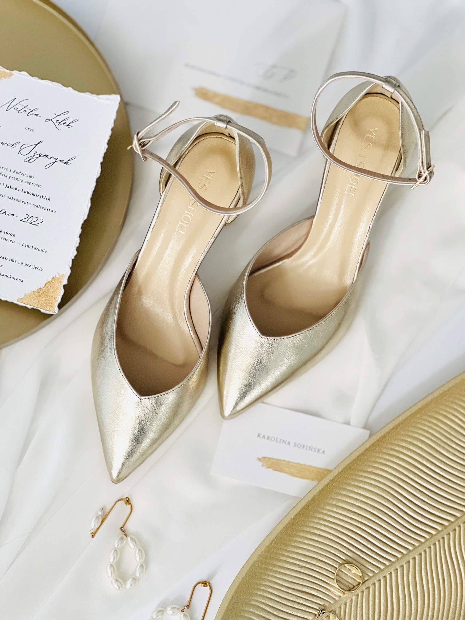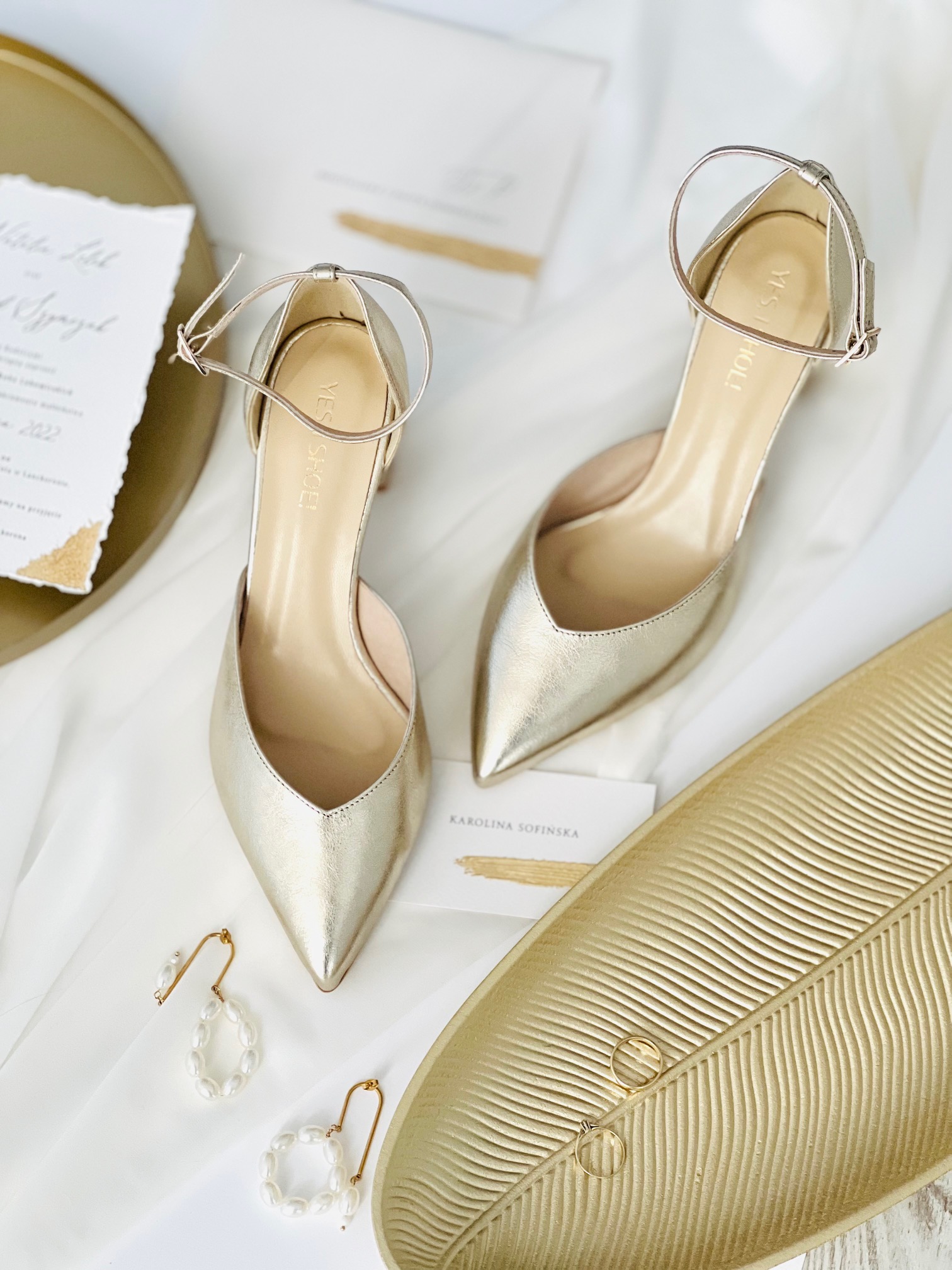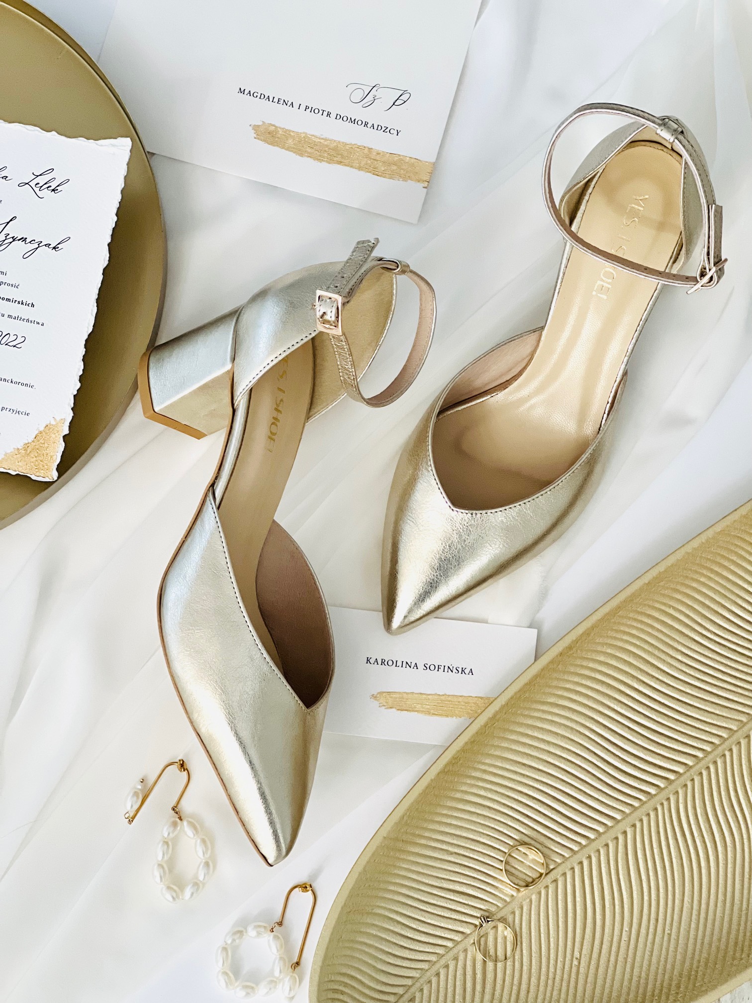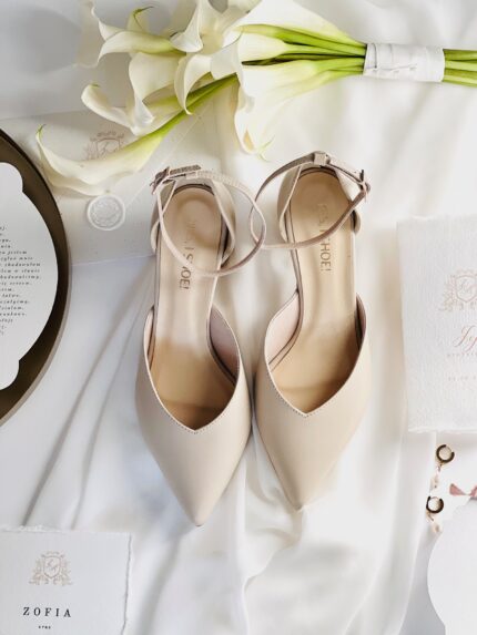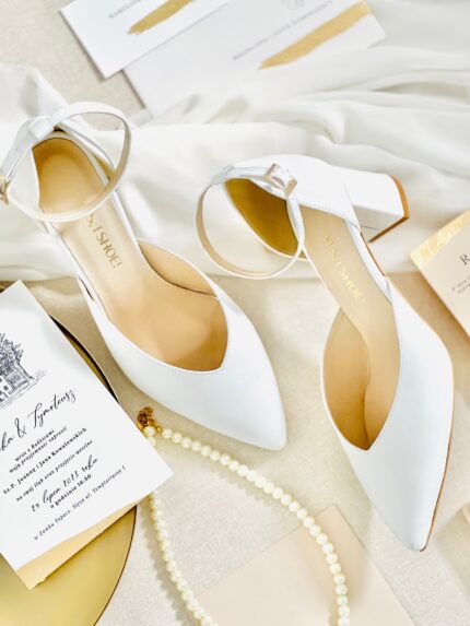 Model Eve Gold to buty ślubne z kolekcji 2023- I’m every Woman. Czółenka ślubne wykonaliśmy w całości z naturalnej, miękkiej skóry licowej w kolorze złotym Buty ślubne wyróżnia zabudowany nosek wycięty w szpic, co optycznie wydłuży sylwetkę.