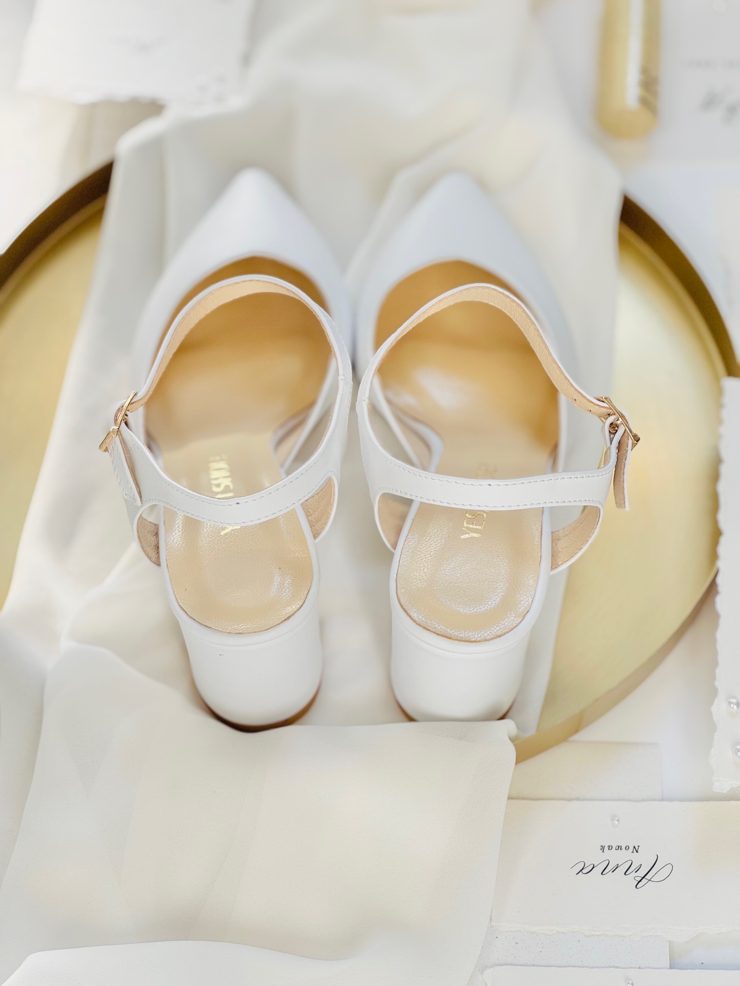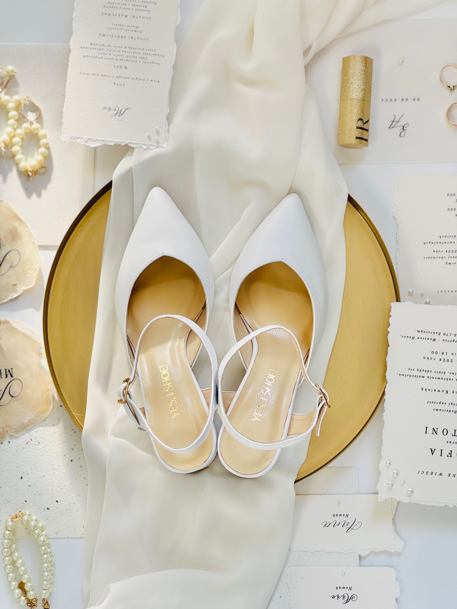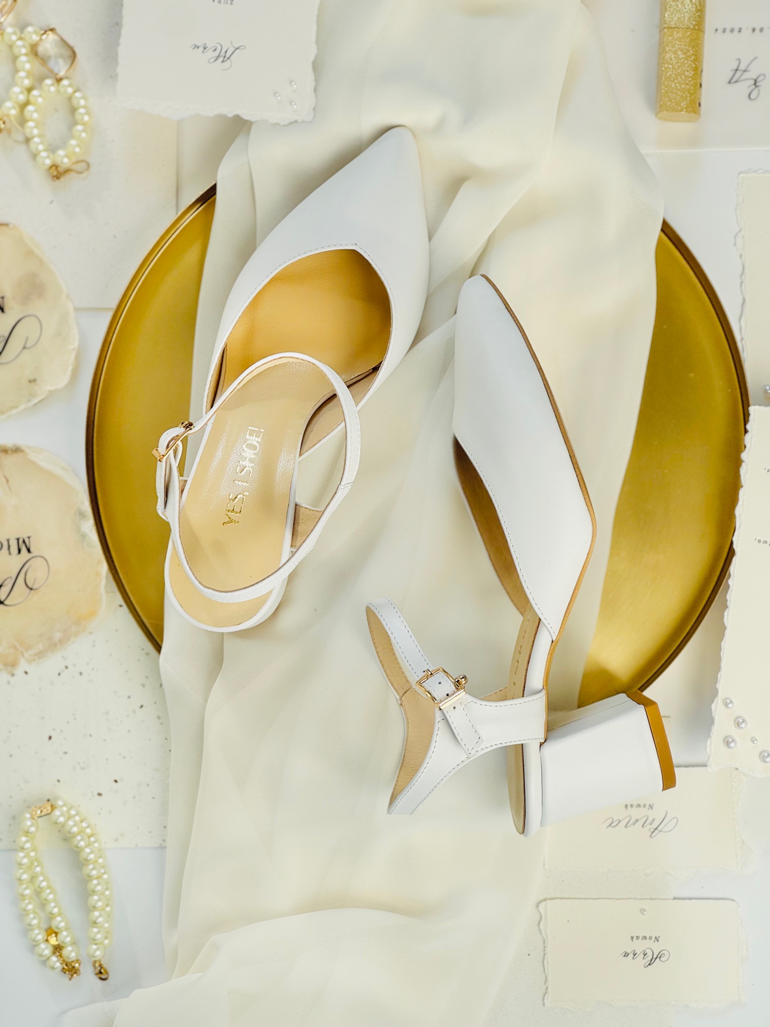 Model Everly Ivory to buty ślubne z kolekcji 2025- SISTERHOOD. Czółenka ślubne wykonaliśmy w całości z naturalnej, miękkiej skóry licowej w kolorze przełamanej bieli. Buty ślubne wyróżnia zabudowany nosek wycięty w szpic, co optycznie wydłuży sylwetkę.