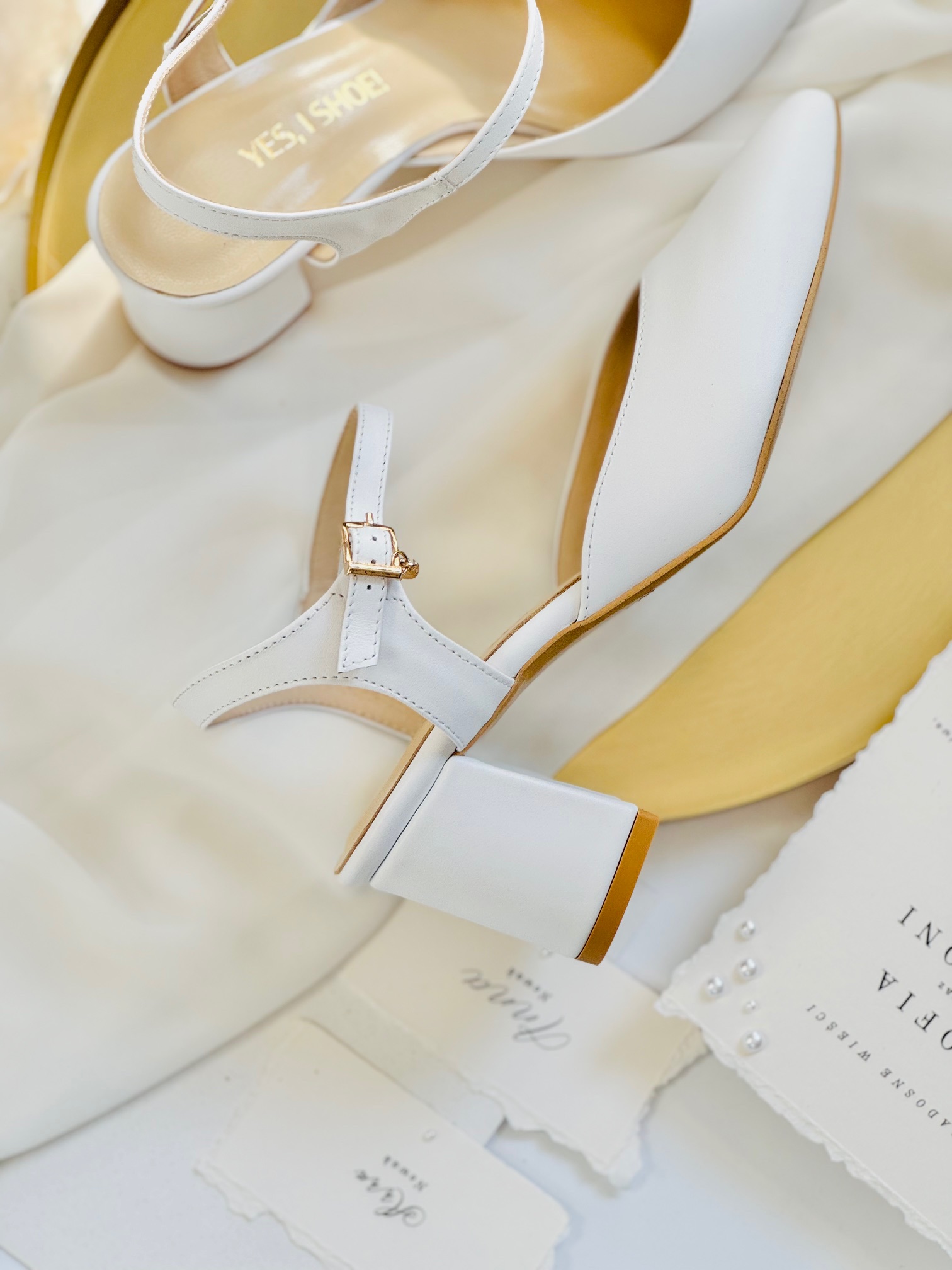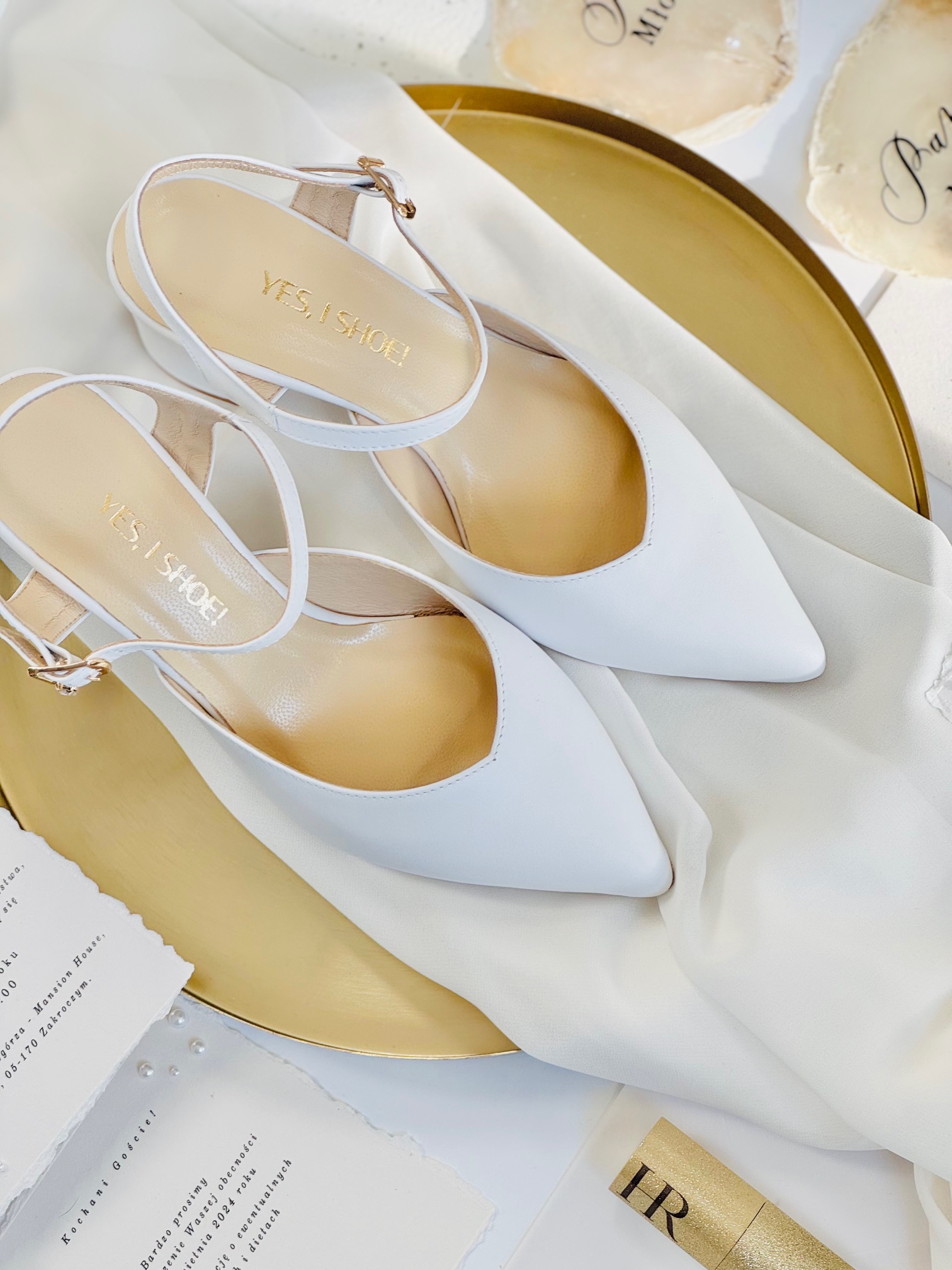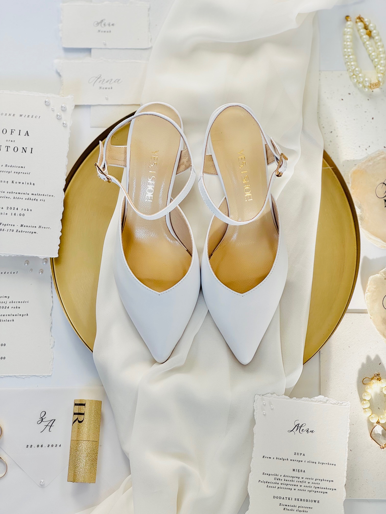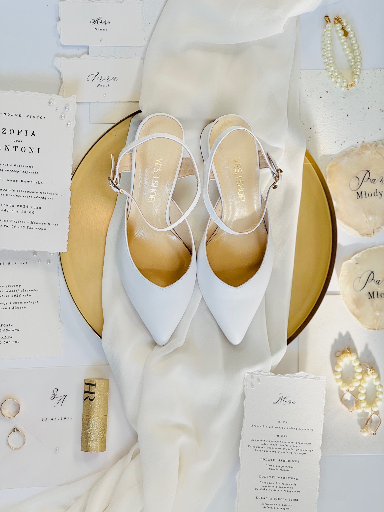Model Everly Ivory to buty ślubne z kolekcji 2025- SISTERHOOD. Czółenka ślubne wykonaliśmy w całości z naturalnej, miękkiej skóry licowej w kolorze przełamanej bieli. Buty ślubne wyróżnia zabudowany nosek wycięty w szpic, co optycznie wydłuży sylwetkę.