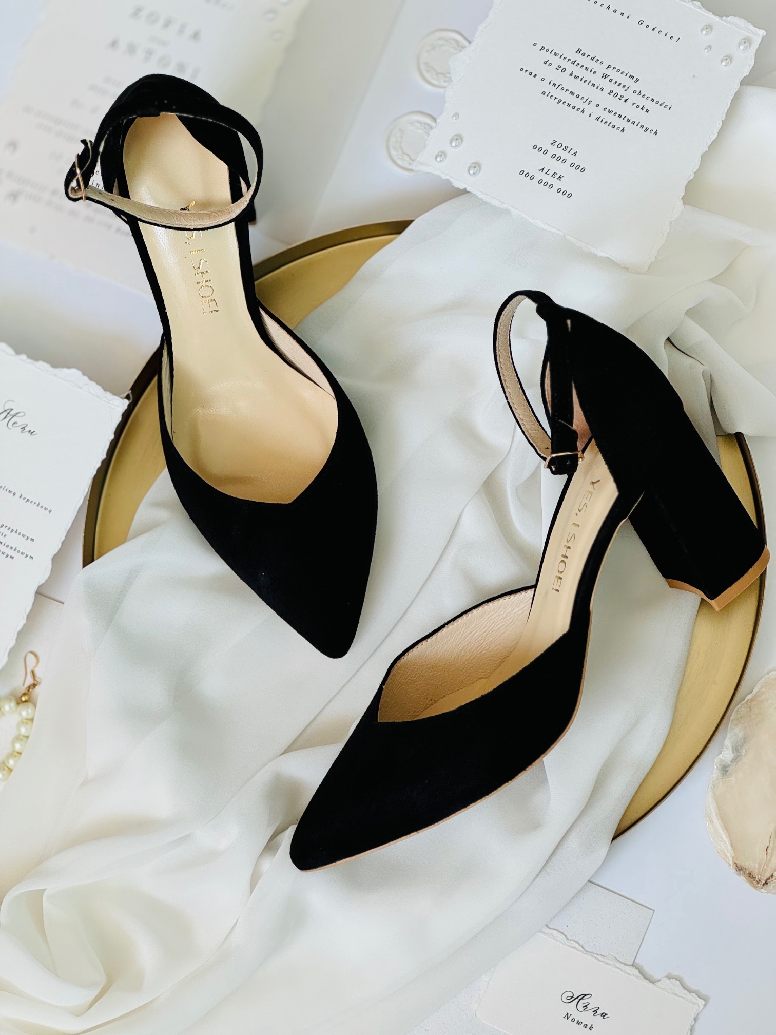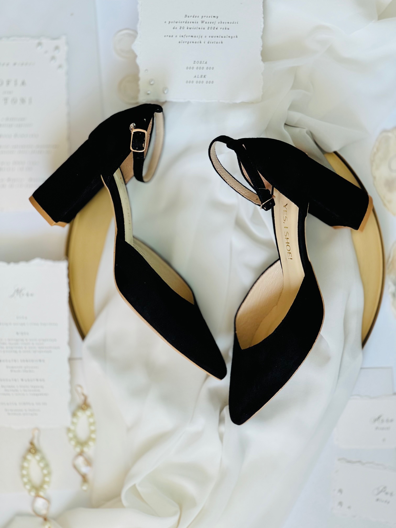 Model Evie Black to buty damskie z kolekcji 2025- SISTERHOOD. Czółenka ślubne wykonaliśmy w całości z naturalnej, miękkiej skóry zamszowej w kolorze czarnym. Buty wyróżnia zabudowany nosek wycięty w szpic, co optycznie wydłuży sylwetkę.
