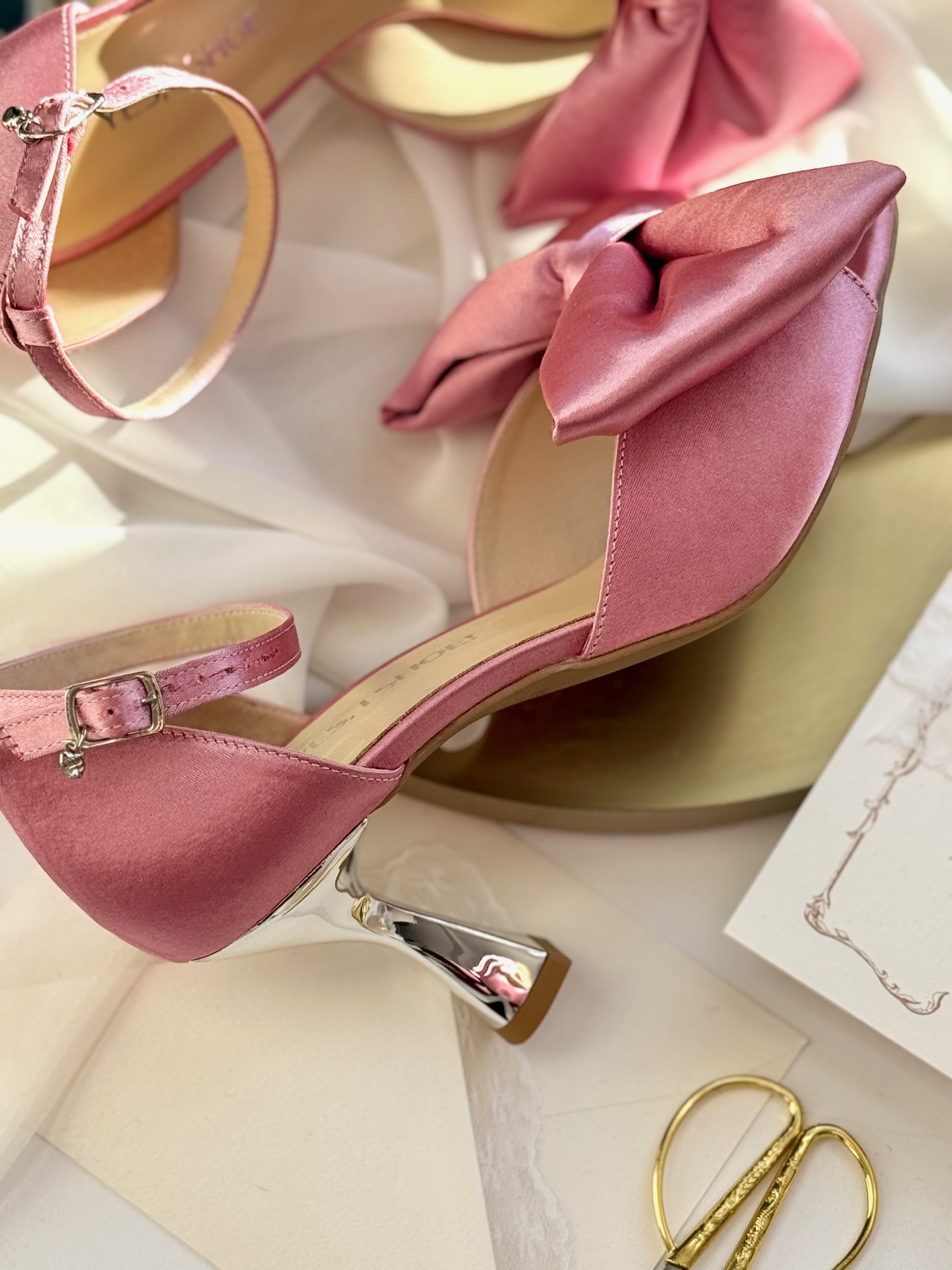 Buty Holly Ivory są wykonane z wysokiej jakości satyny w eleganckim odcieniu różu, który doskonale komponuje się z różnymi stylami sukien ślubnych. Ich obcas w kształcie kielicha o wysokości ok 8 cm dodaje subtelnej elegancji i podkreśla kobiecą sylwetkę. Obcas wykonaliśmy w kolorze srebrnym.