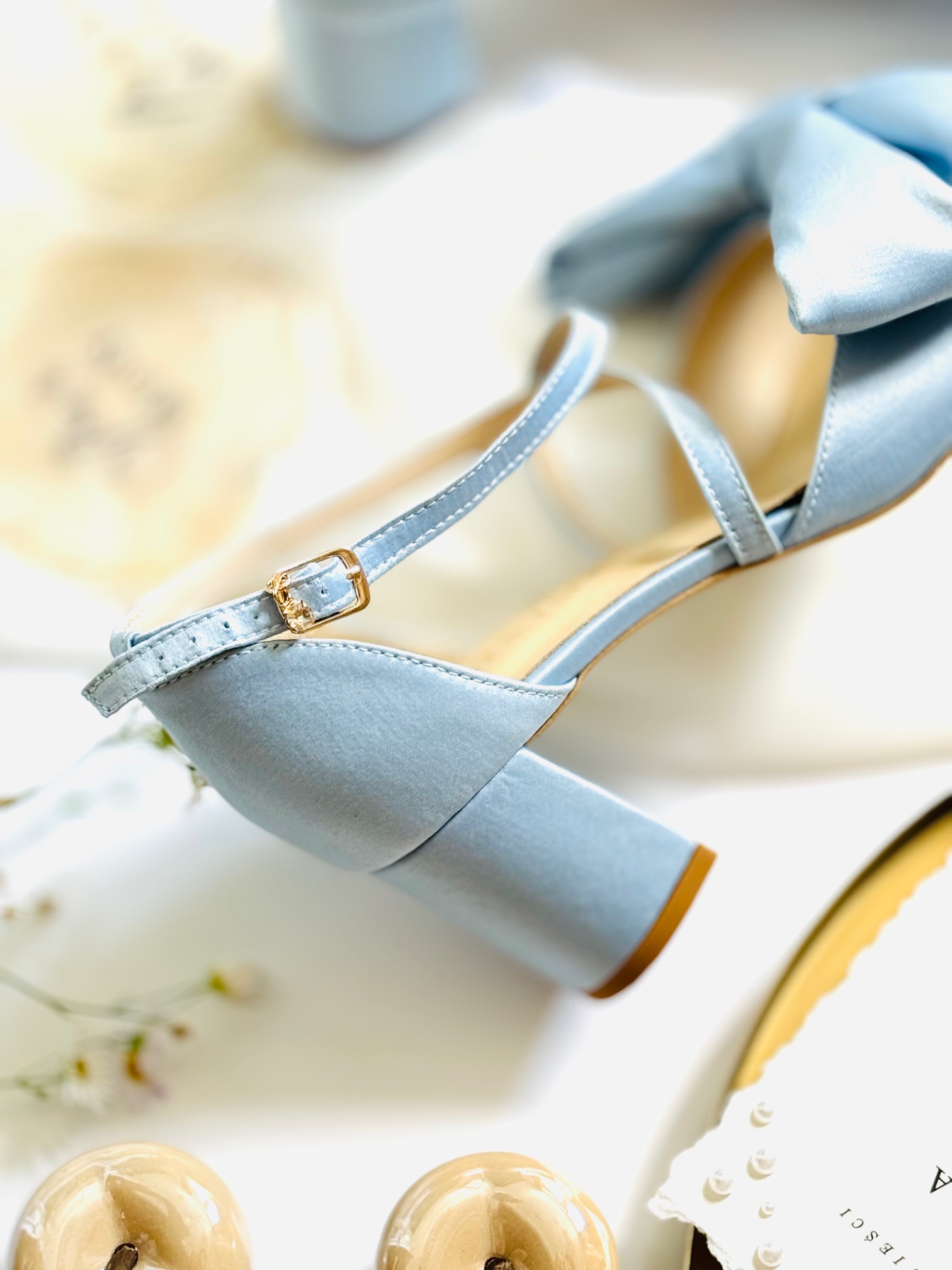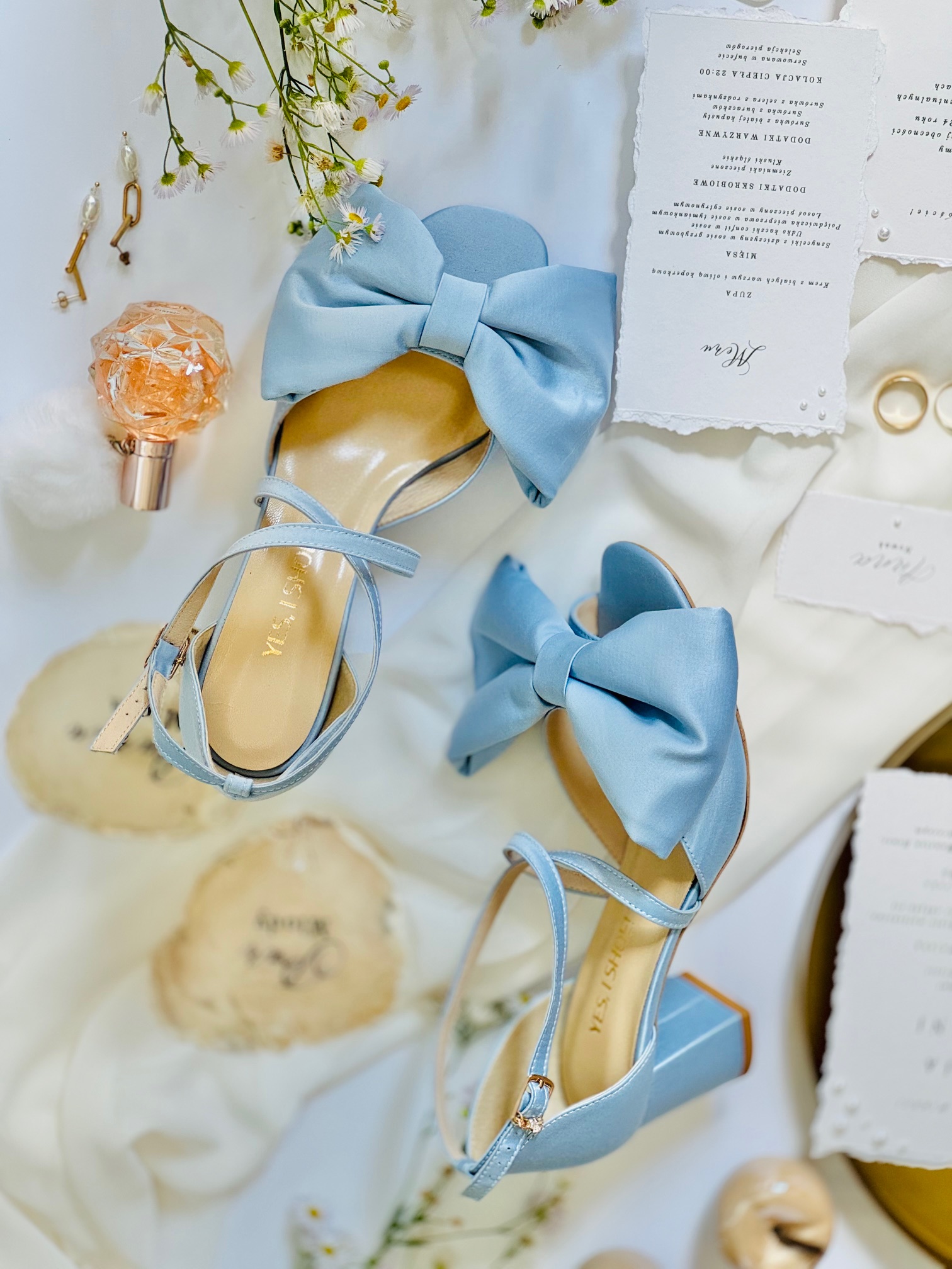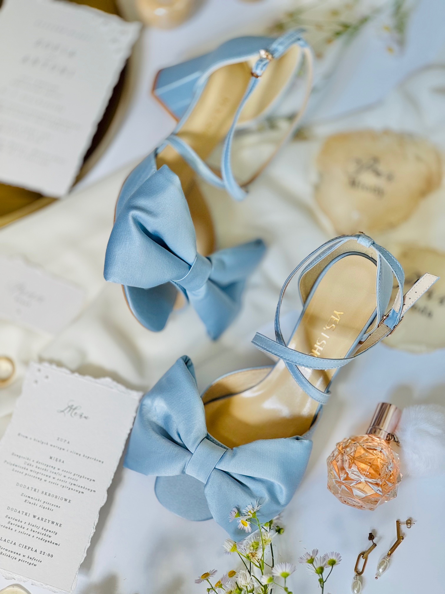 Buty Hollyn Baby Blue są wykonane z wysokiej jakości satyny w eleganckim odcieniu błękitu, który doskonale komponuje się z różnymi stylami sukien ślubnych. Ich obcas w kształcie słupka o wysokości ok 6,5 cm zapewnia stabilność i komfort przez cały dzień..