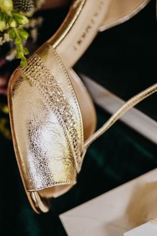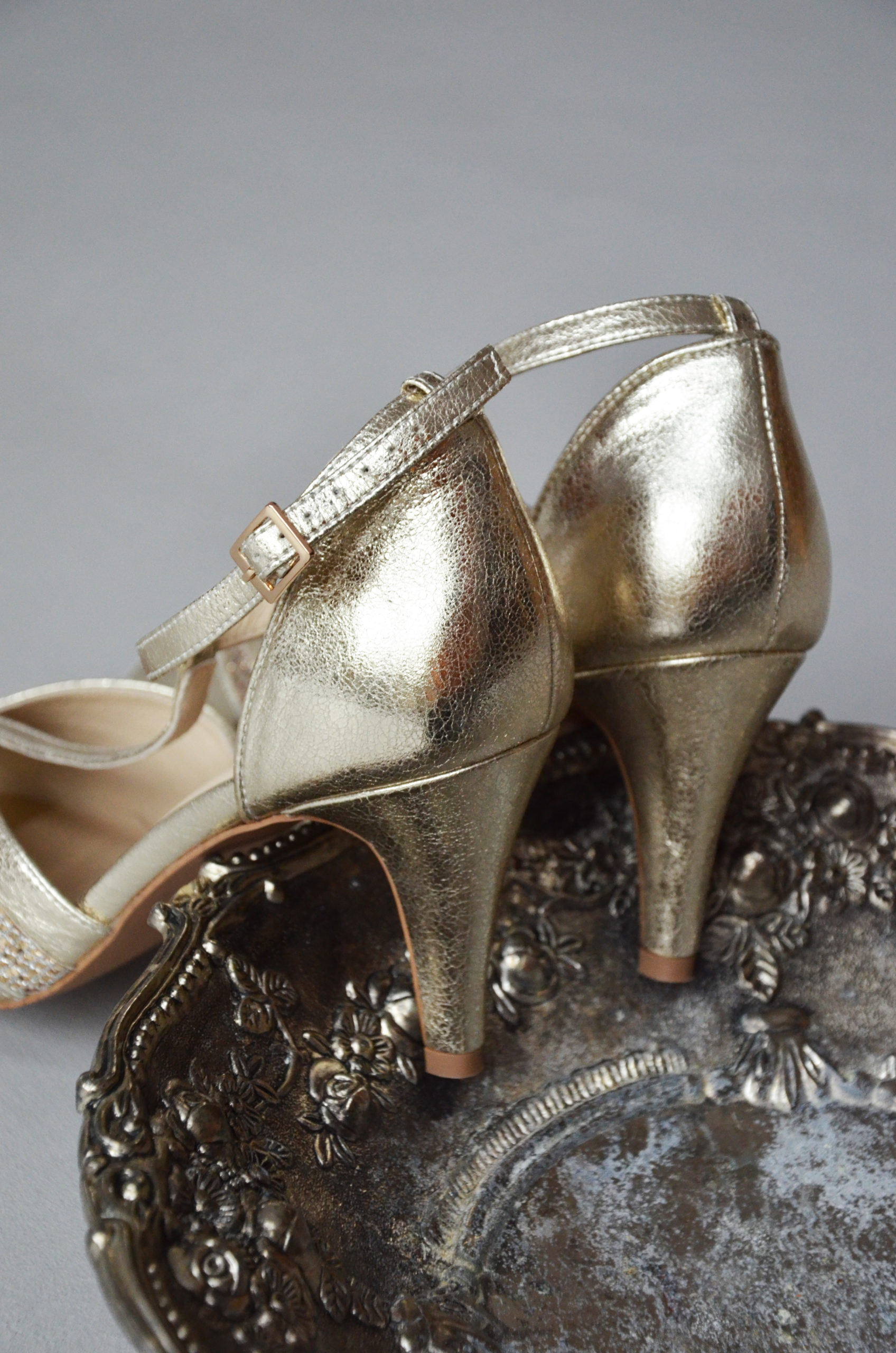 Złote buty ślubne z paskiem