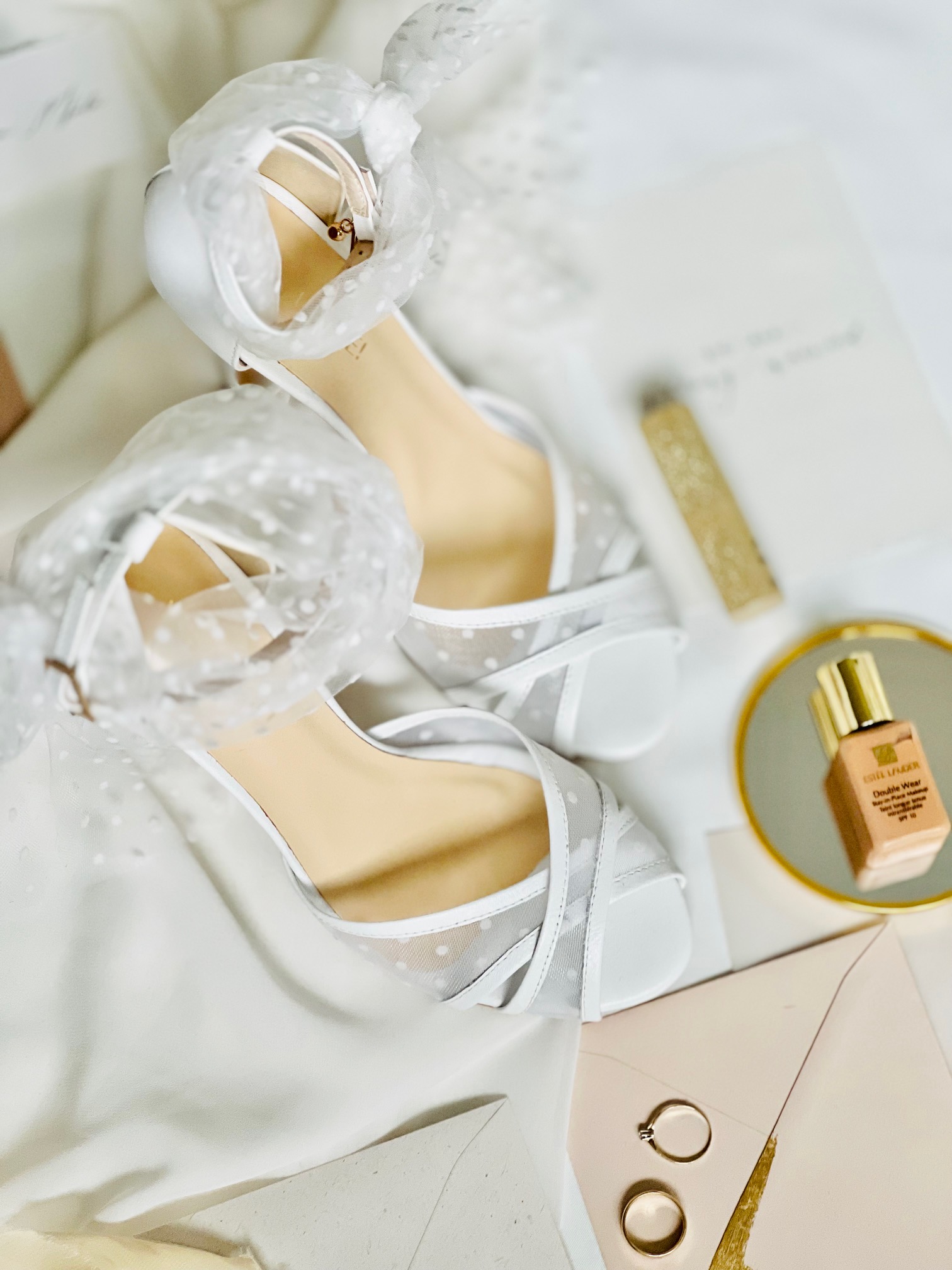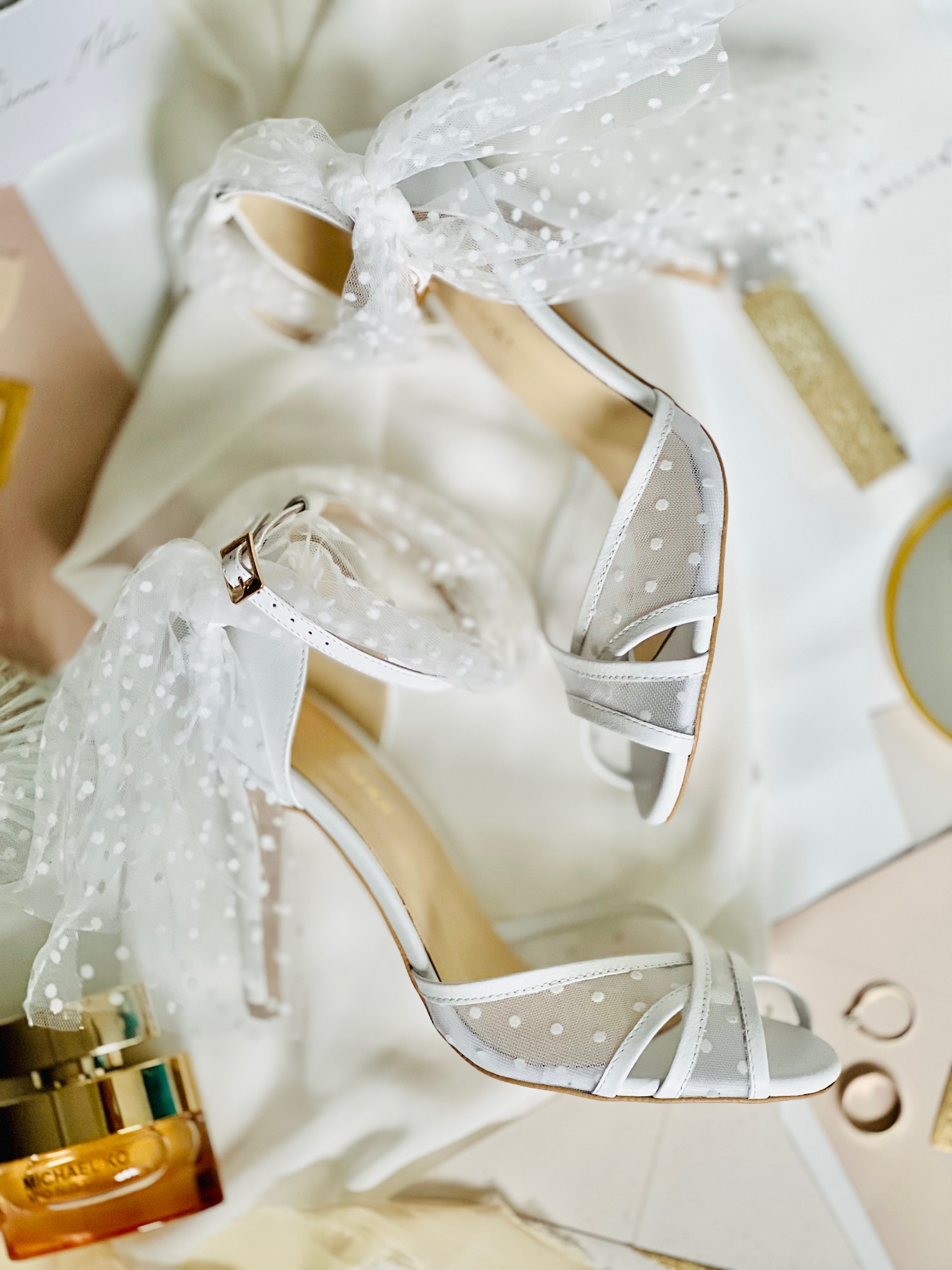 Ich krzyżowy przód z tiulem w groszki dodaje im delikatności i romantyzmu, idealnie komponując się z atmosferą ślubu. Dodatkowo, kokarda na kostce z tiulu to subtelny detal, który podkreśla kobiecość i dodaje uroku.
