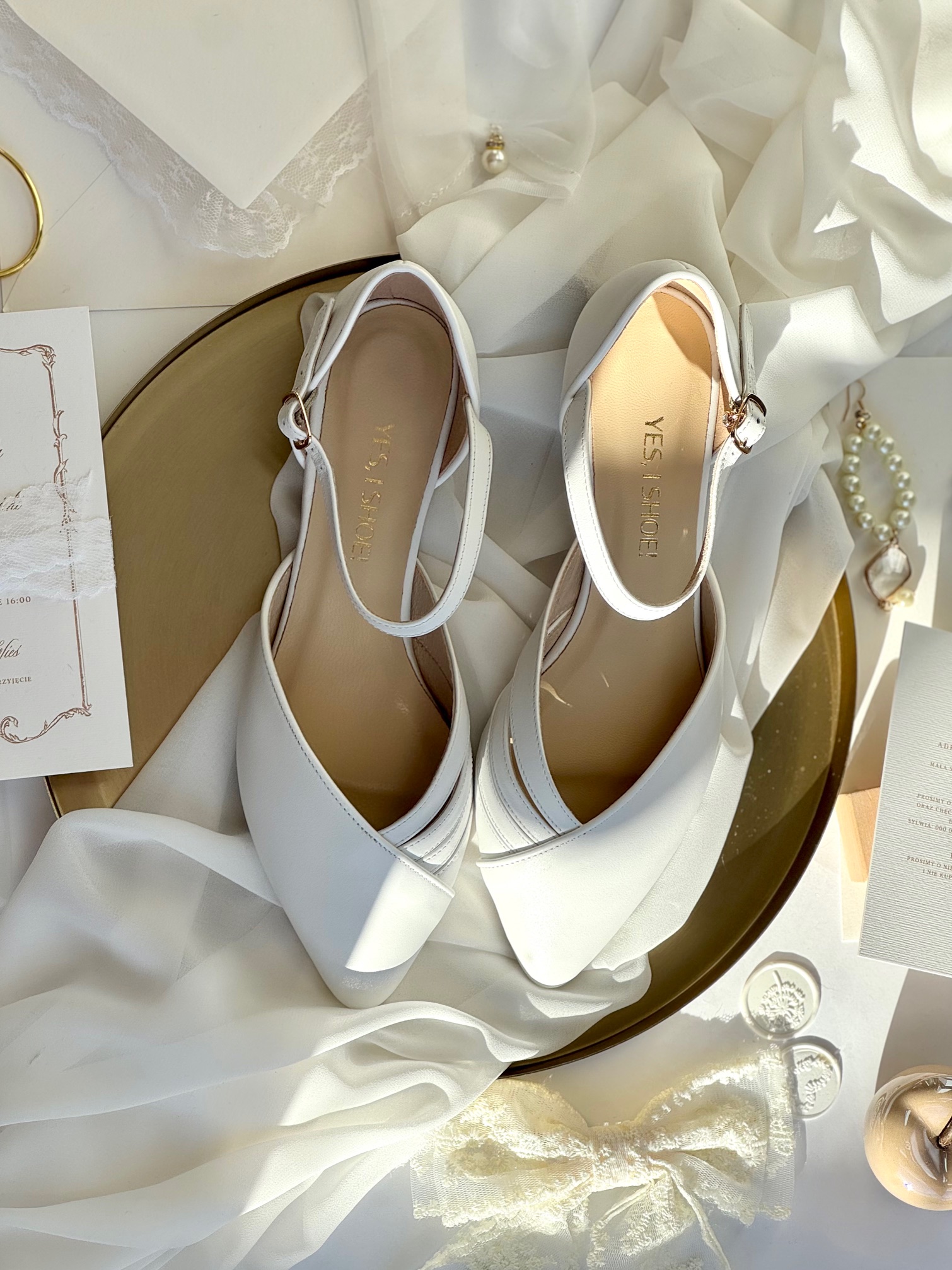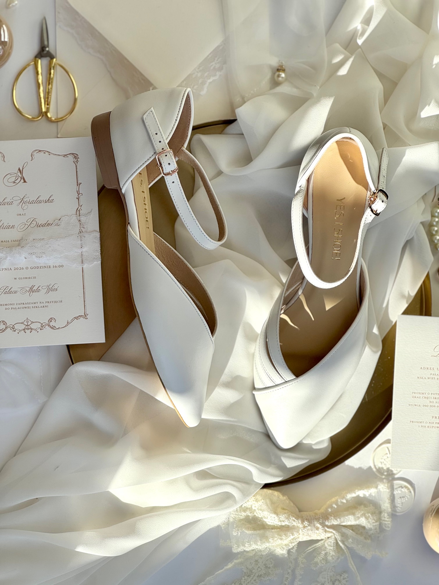 Buty ślubne Whitney zostały wykonane z najwyższej jakości skóry licowej w pięknym odcieniu przełamanej bieli. Ich delikatny kolor doskonale komponuje się z różnymi stylami sukien ślubnych, dodając im wyjątkowego uroku.